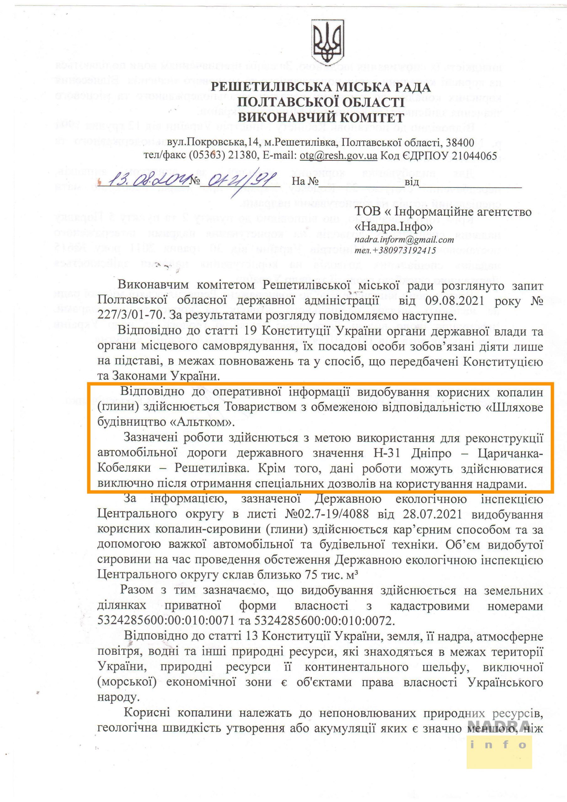 Зауважимо, відповідь Решетилівської міської ради про постачання видобутої без спецдозволу глини на будівництво дороги Н-31 доповнює раніше отриману заяву Служби автомобільних доріг Полтавської області. Нагадаємо в САД заявили: “… З наданих матеріалів не можливо встановити виконавця робіт … Корисні копалини не використовуються при будівництві доріг“.