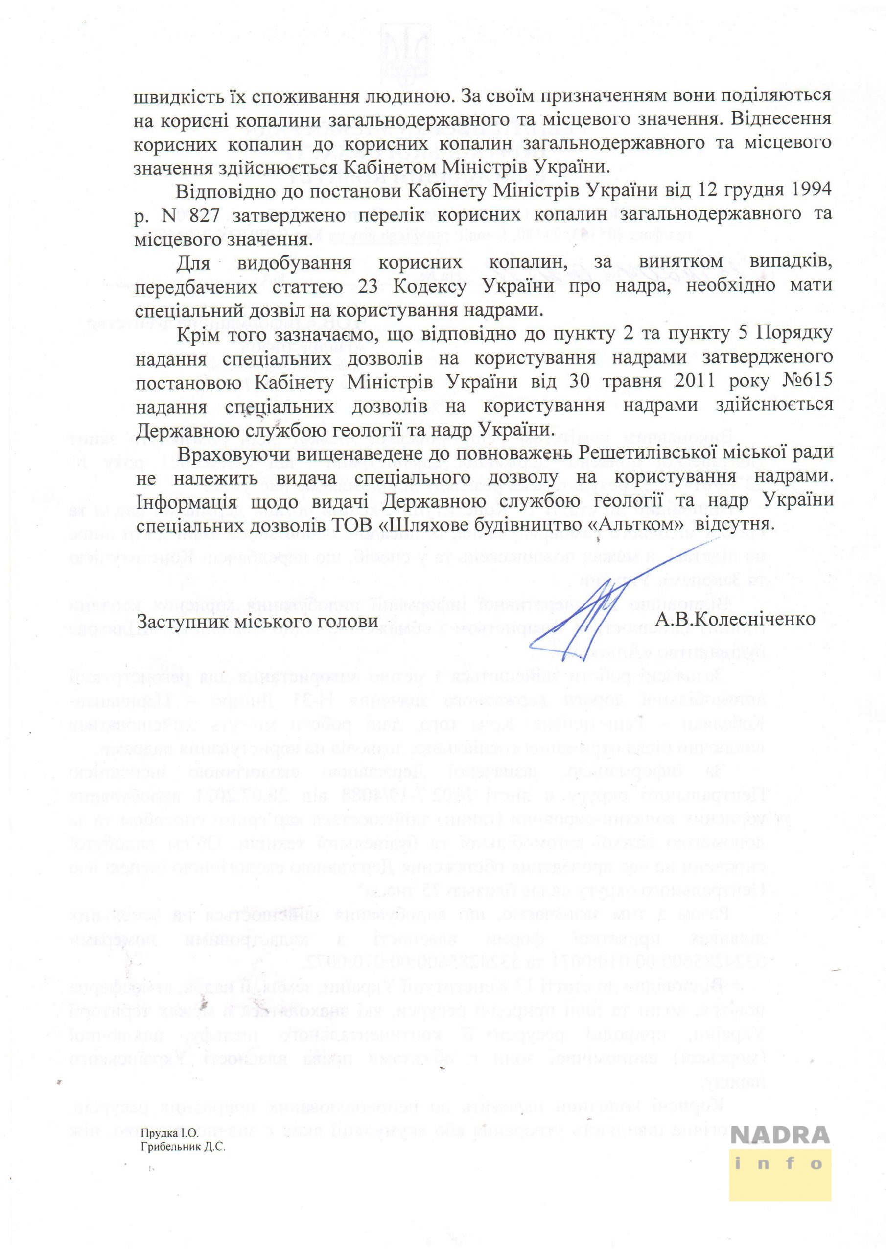 “Зазначені роботи здійснюються з метою використання для реконструкції автомобільної дороги державного значення Н-31 Дніпро-Царичанка-Кобеляки-Решетилівка. … Інформація щодо видачі Державною службою геології та надр України спеціальних дозволів ТОВ “Шляхове будівництво “Альтком” відсутня”, – йдеться у відповіді на наш запит.