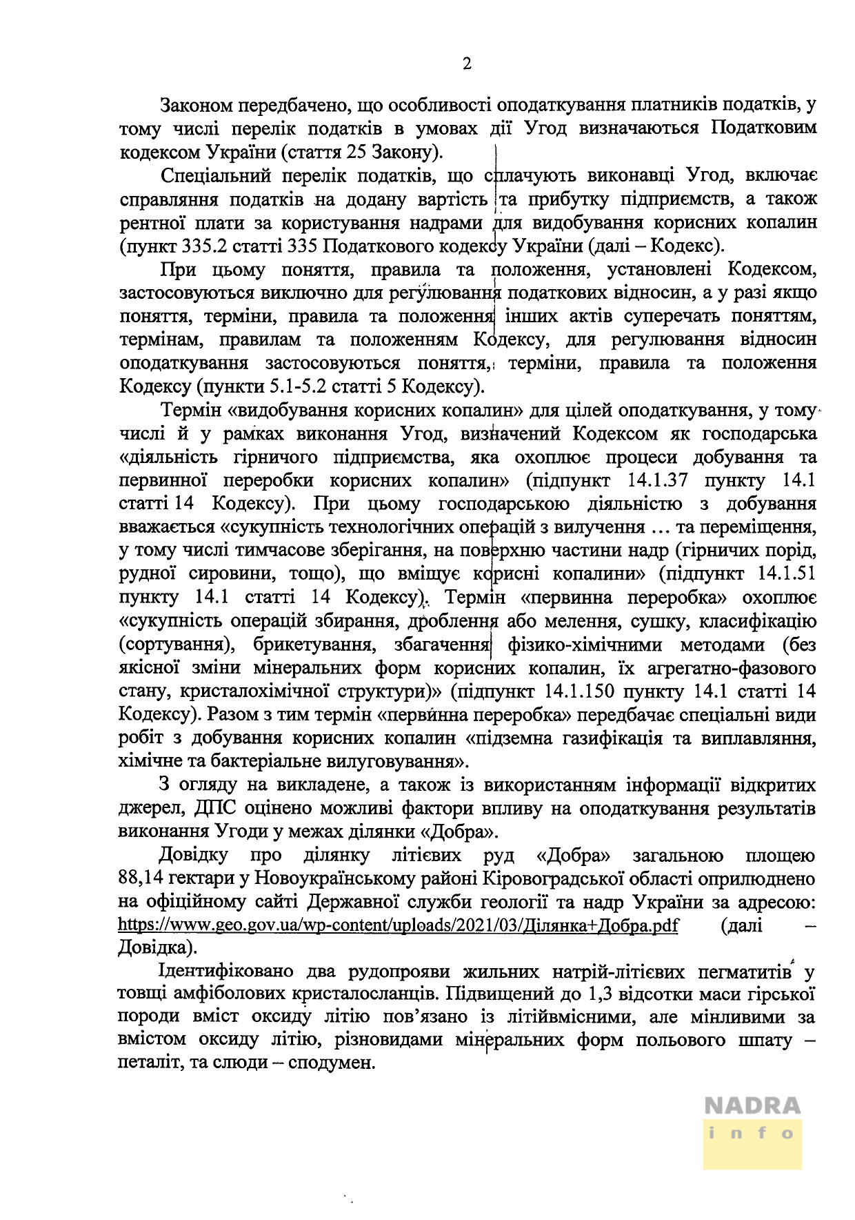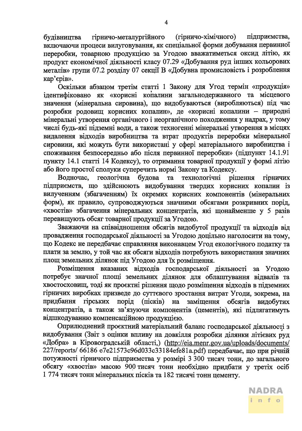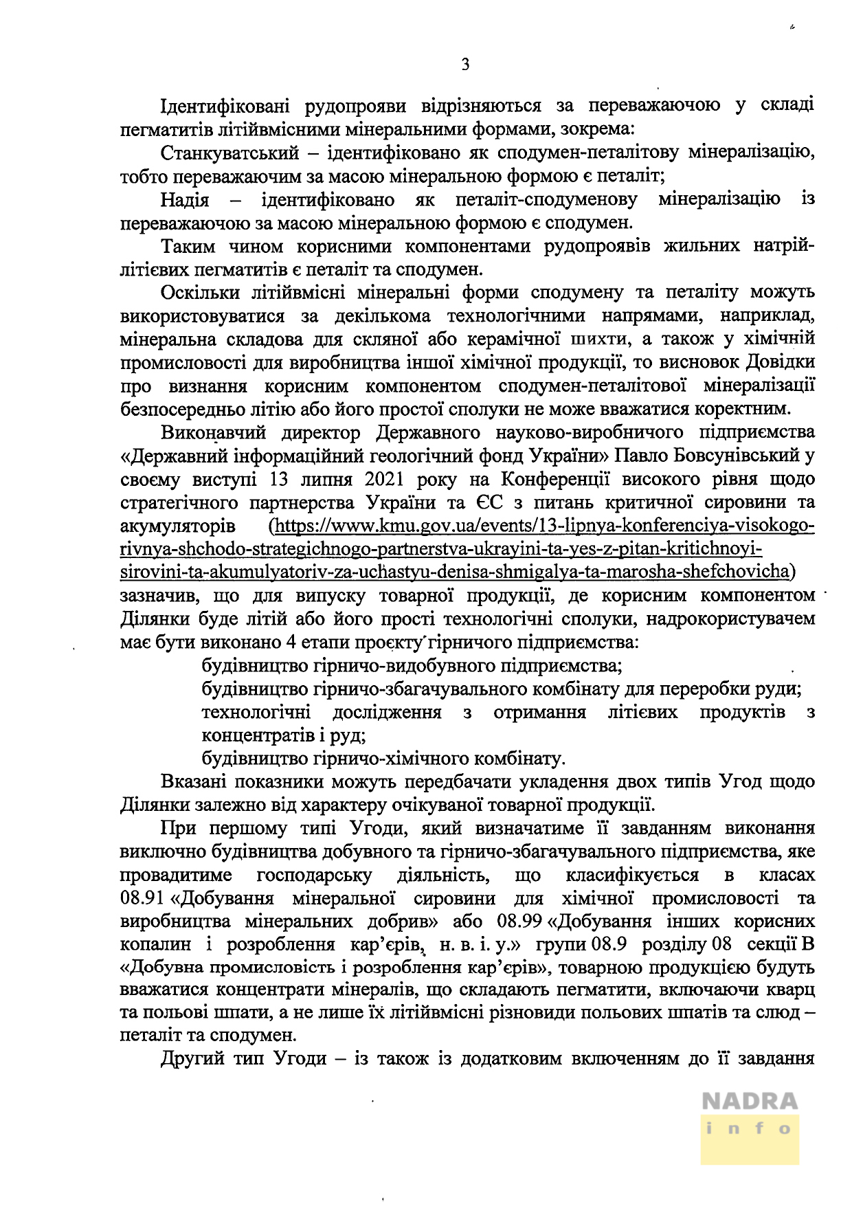 Висновок довідки про визнання корисним компонентом сподумен-петалітової мінералізації безпосередньо літію або його простої сполуки у повідомленні названо не коректним, “оскільки літійвмісні форми сподумену та петаліту можуть використовуватися за декількома технологічними напрямками, наприклад, мінеральна складова для скляної або керамічної шихти, а також у хімічній промисловості для виробництва іншої хімічної продукції”.