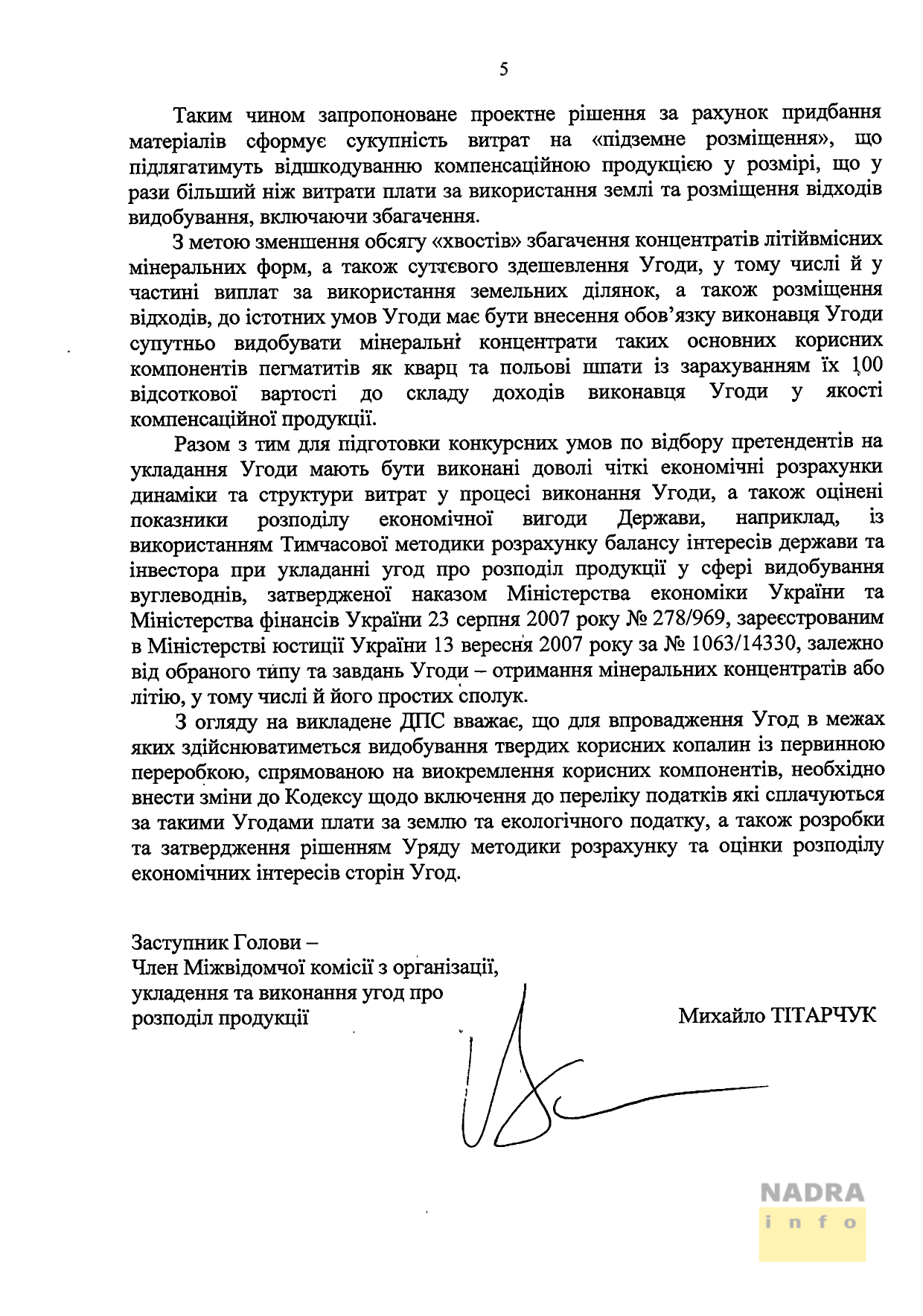 Відтак, в ДПС вважають, що з метою зменшення “хвостів” і здешевлення УРП, до суттєвих умов Угоди має бути внесено обовʼязок виконавця “супутньо видобувати мінеральні концентрати таких основних корисних компонентів пегматитів як кварц та польові шпати із зарахуванням їх 100 відсоткової вартості до складу доходів виконавця Угоди у якості компенсаційної продукції”.