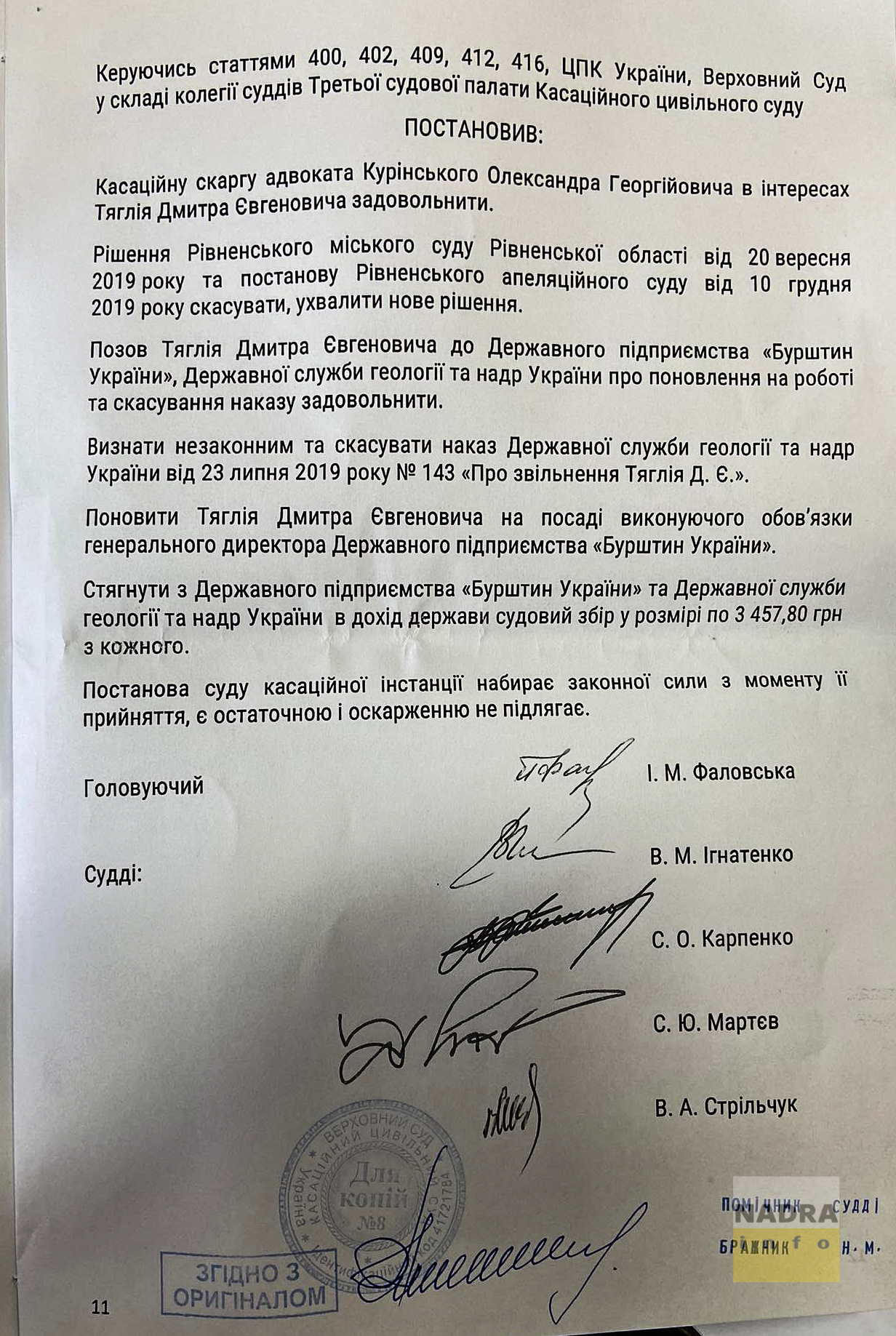 Тяглій Дмитро має бути поновлений на посаді виконуючого обовʼязки генерального директора державного підприємства “Бурштин України”. Про це NADRA.info повідомив адвокат Дмитра Тяглія Олександр Курінський, який також надав копію Постанови Верховного суду. Із повним текстом Постанови можна ознайомитися за посиланням.