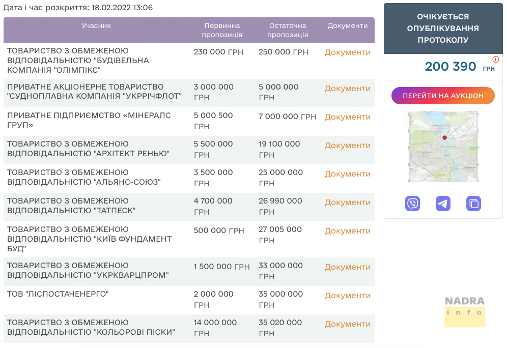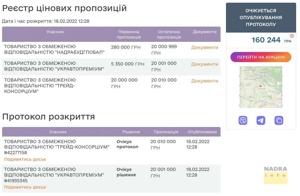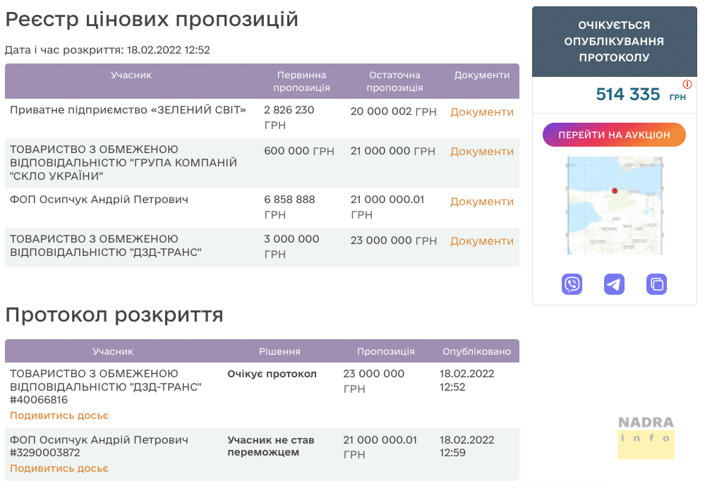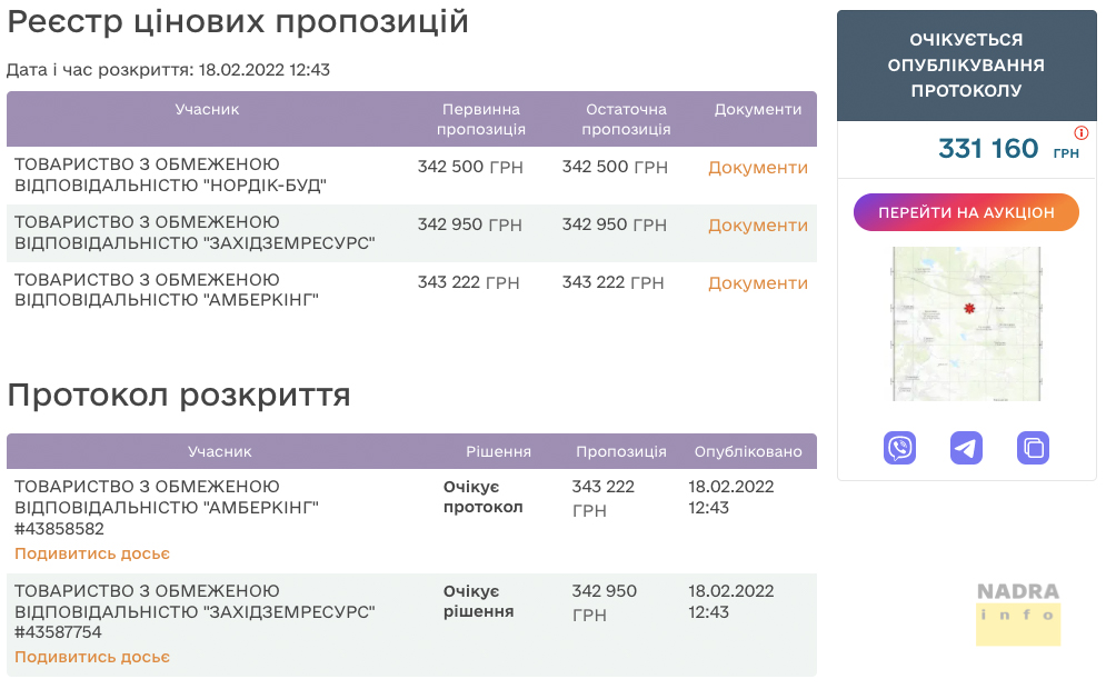 Ділянка надр в урочищі “Рінь 2“ (Львівська обл.), геологічне вивчення з дослідно-промисловою розробкою, на 5 років. Лот виставлявся вперше. Ціна стартувала з 11 744 грн. Змагалися пʼятеро, перемогло ТОВ “Синьовода“ – 812 000 грн. Другий номер ТОВ “Сенд Маркет” запропонувало 790 000 грн: