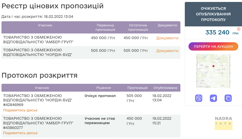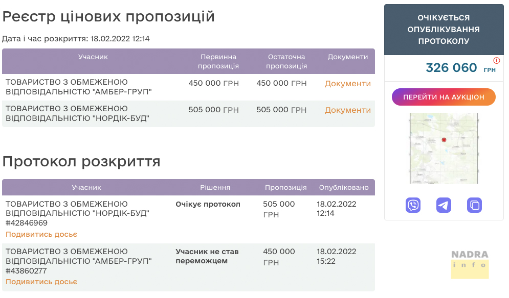 Ділянка Гальбин-8 (Рівненська обл.), геологічне вивчення бурштиноносних надр, у тому числі дослідно-промислова розробка родовищ з подальшим видобуванням бурштину (промислова розробка родовищ), 5 років. Лот виставлявся вперше. Ціна стартувала з 335 240 грн. Змагалися двоє, перемогло ТОВ “Нордік-Буд“ – 505 000 грн. Другий номер ТОВ “Амбер-Груп” запропонував 450 000 грн і одразу відмовився від права купити лот, якщо його не викупить переможець: