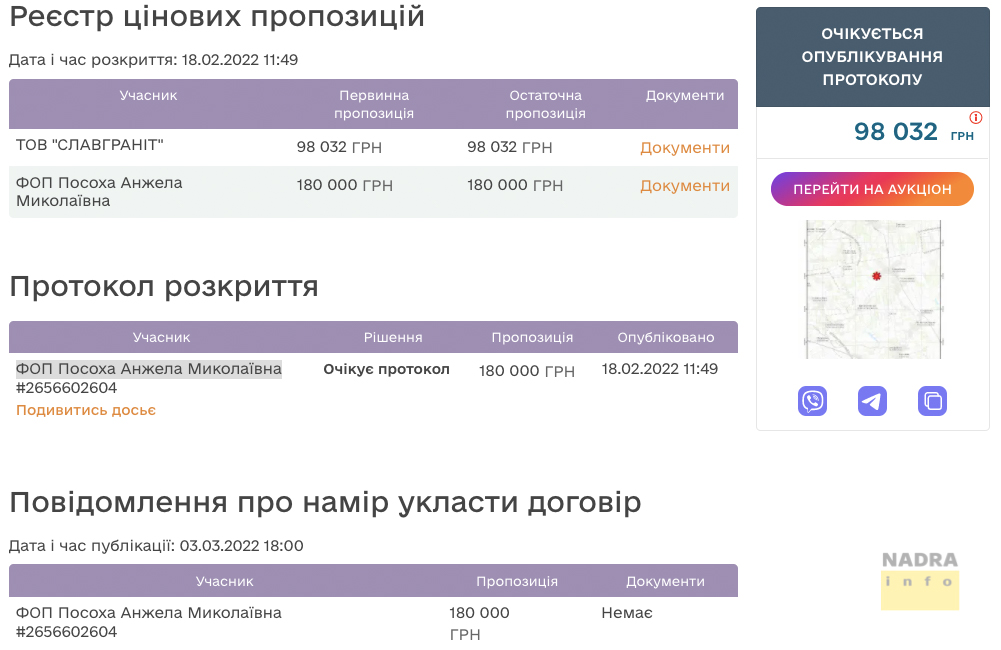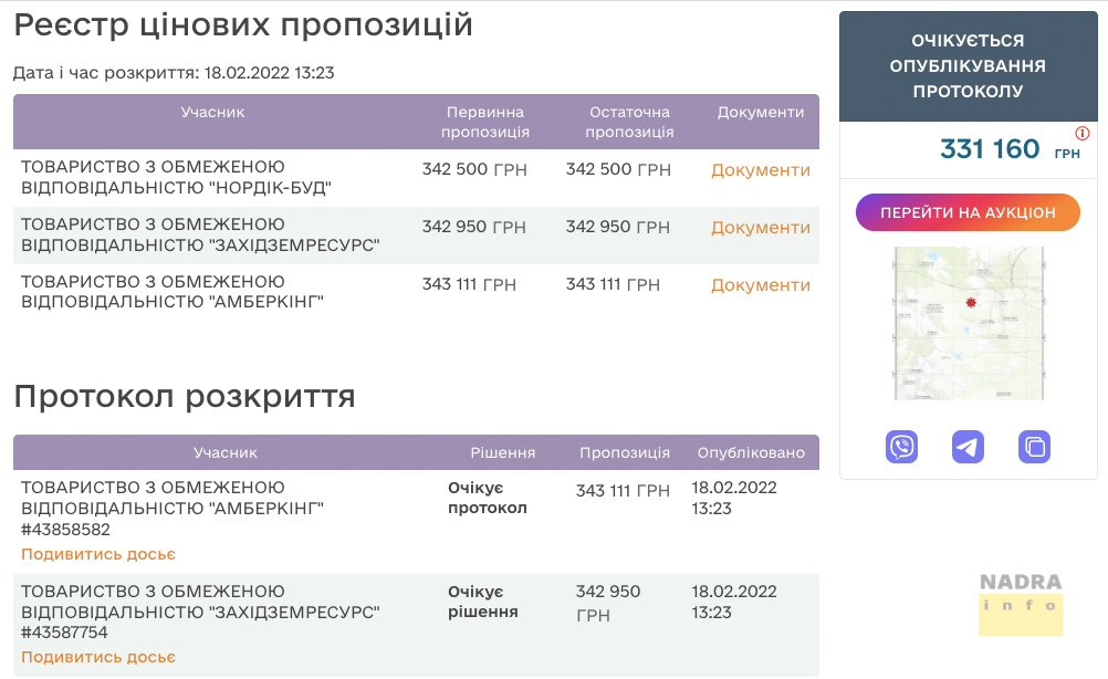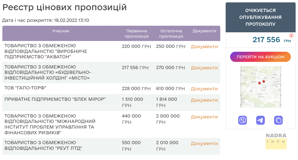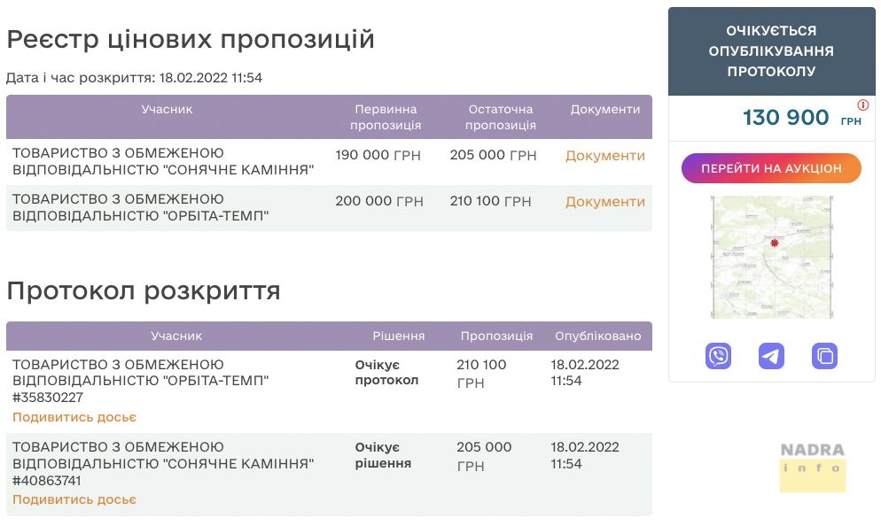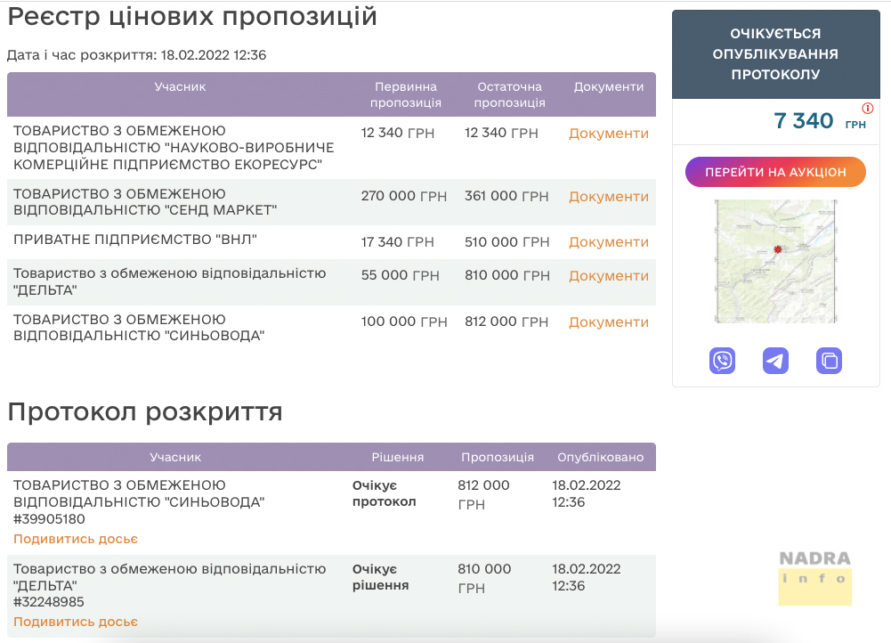 Ділянка надр в урочищі “Рінь 1“ (Львівська обл.), геологічне вивчення з дослідно-промисловою розробкою, на 5 років. Лот виставлявся вперше. Ціна стартувала з 7 340 грн. Змагалися пʼятеро, перемогло ТОВ “Синьовода“ – 812 000 грн. Другий номер ТОВ “Дельта” запропонувало 810 000 грн: