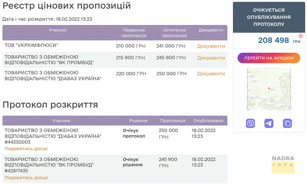Ділянка Мочулянка (Рівненська обл.), геологічне вивчення з дослідно-промисловою розробкою, на 5 років. Лот виставлявся вперше. Ціна стартувала з 208 498 грн. Змагалися двоє, перемогло ТОВ “Діабаз Україна“ – 250 000 грн. Другий номер ТОВ “ВК Промбуд” запропонувало 245 900 грн: