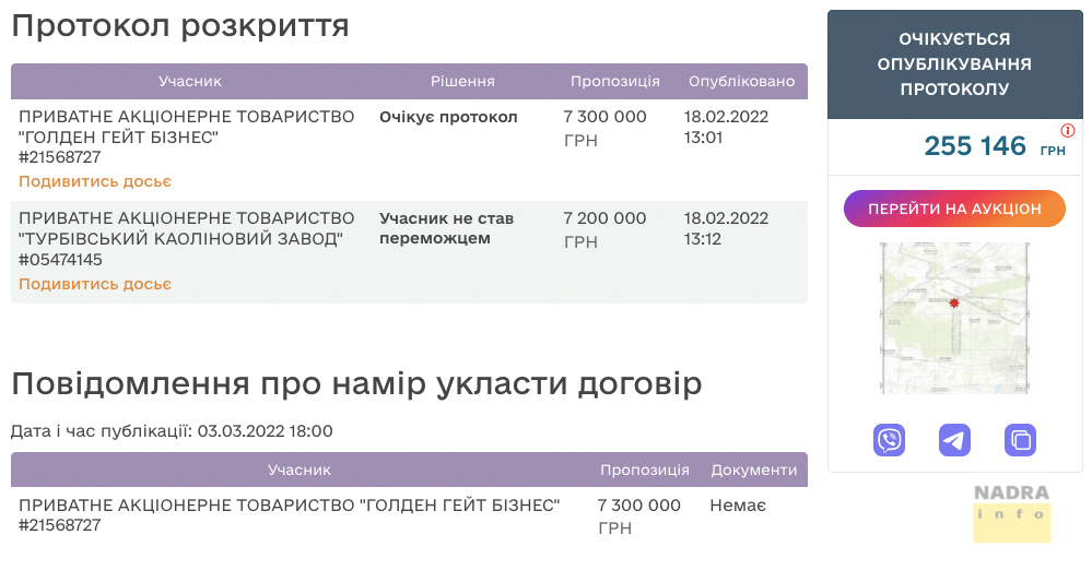 Ділянка Західна (Хмельницька обл.), геологічне вивчення з дослідно-промисловою розробкою, на 5 років. Лот виставлявся вперше. Ціна стартувала з 255 146 грн. Змагалися пʼятеро, перемогло ПрАТ “Голден Гейт Бізнес“ – 7 300 000 грн. Другий номер ПрАТ “Турбівський каоліновий завод” запропонувало 7 200 000 грн і одразу відмовилося від права купити лот, якщо його не викупить переможець: