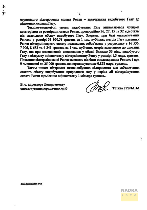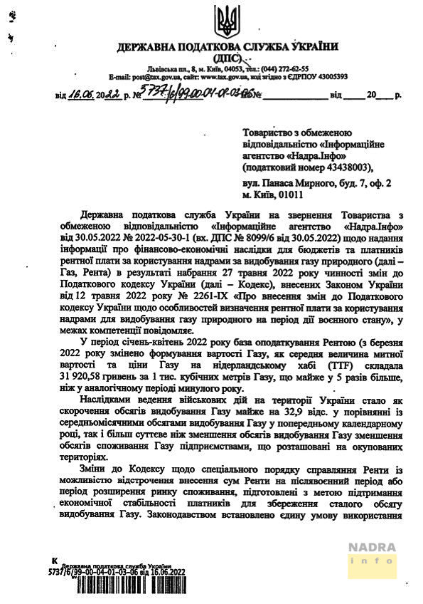 У Службі звернули увагу на одночасне скорочення споживання і видобутку природного газу в Україні (на тлі війни РФ проти України), а також 5-кратне зростання оподаткування газовидобувних компаній рентою. Цитуємо відповідь (сканкопію оригіналу додаємо нижче), за підписом в.о. директора Департаменту оподаткування юридичних осіб Тетяни Гречаної: