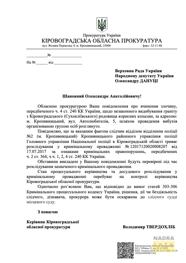 «Ваше звернення щодо порушення правил охорони та використання надр на території родовища «Сухокліївське», незаконної діяльності службових осіб ВАТ «Кіровоградський кар’єр», ТОВ «Гранторг», ТОВ «Гранітпромпереробка» та стану досудового розслідування у кримінальному провадженні No 12017120020008207 за ознаками кримінальних правопорушень, передбачених ч.ч. 1, 2, 4 ст. 240, ч. 2 ст. 364 КК України розглянуто.