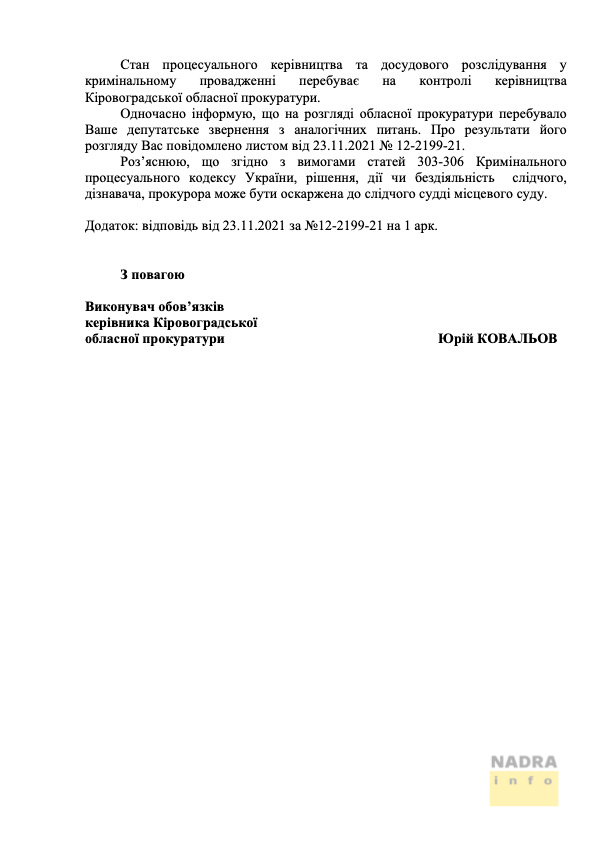 Доки ми готували цей матеріал до публікації, стало відомо про першу відповідь на червневе звернення пана Дануци до Ірини Венедіктової. Її заступник Максим Якубовський повідомив народному депутату, що звернення переслали до керівника Кіровоградської обласної прокуратури, звідки і мають надати відповідь: