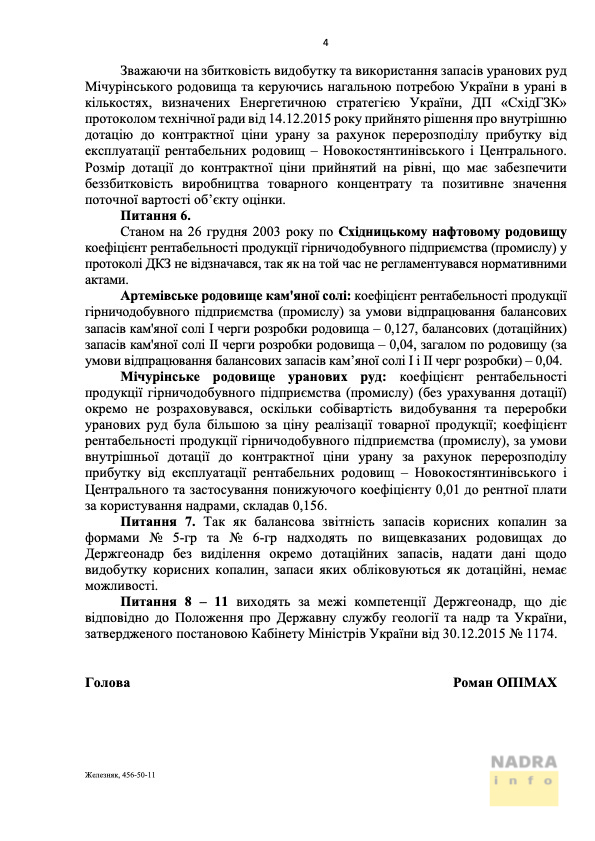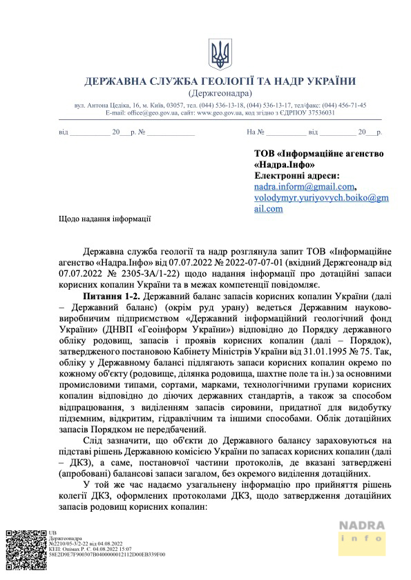 «Так як балансова звітність запасів корисних копалин за формами №5-ГР та №6-ГР надходять по вищевказаних родовищах до Держгеонадр без виділення окремо дотаційних запасів, надати дані щодо видобутку корисних копалин, запаси яких обліковуються як дотаційні, немає можливості», – відповіли в Службі: