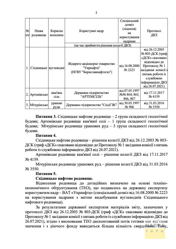 В Держгеонадр надали узагальнену інформацію про прийняття рішень колегії ДКЗ, оформлених протоколами ДКЗ, щодо затвердження дотаційних запасів родовищ корисних копалин.