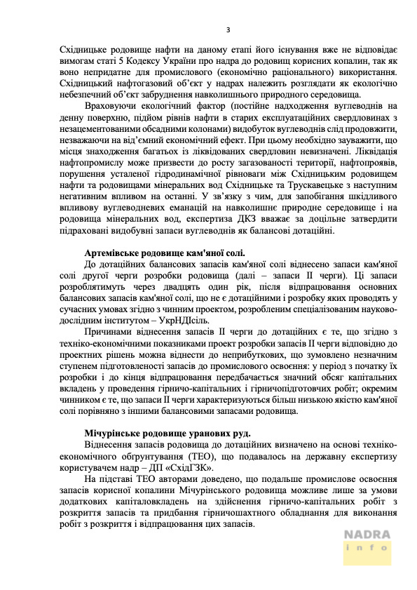 «Державний баланс запасів корисних копалин України (далі – Державний баланс) (окрім руд урану) ведеться Державним науково-виробничим підприємством «Державний інформаційний геологічний фонд України» (ДНВП «Геоінформ України») відповідно до Порядку державного обліку родовищ, запасів і проявів корисних копалин (далі – Порядок), затвердженого постановою Кабінету Міністрів України від 31.01.1995 No 75. Так, обліку у Державному балансі підлягають запаси корисних копалин окремо по кожному об’єкту (родовище, ділянка родовища, шахтне поле та ін.) за основними промисловими типами, сортами, марками, технологічними групами корисних копалин відповідно до діючих державних стандартів, а також за способом відпрацювання, з виділенням запасів сировини, придатної для видобутку підземним, відкритим, гідравлічним та іншими способами. Облік дотаційних запасів Порядком не передбачений», – повідомили у Держгеонадр.