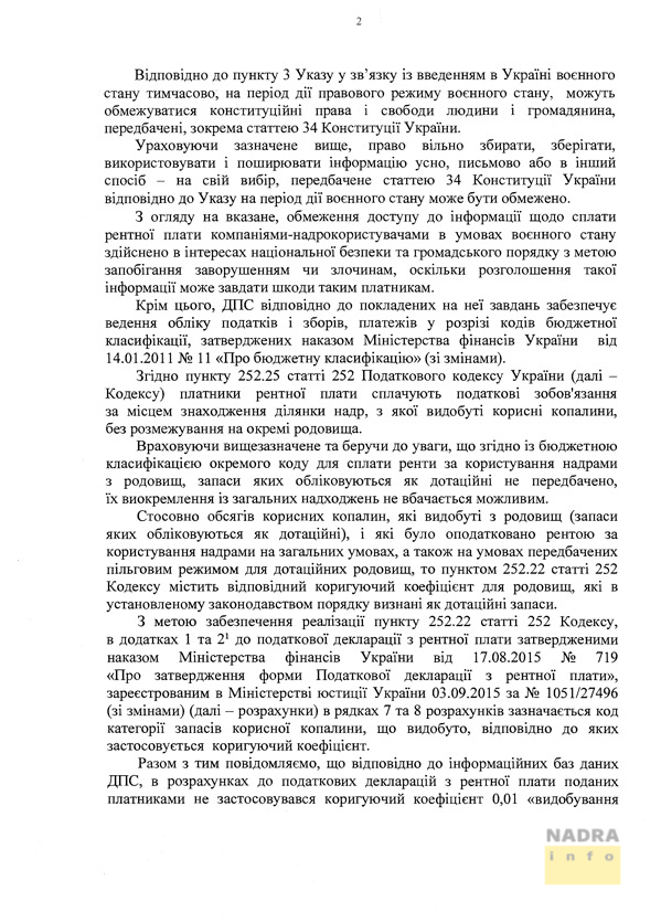 «Стосовно обсягів корисних копалин, які видобуті з родовищ (запаси яких обліковуються як дотаційні), і які було оподатковано рентою за користування надрами на загальних умовах, а також на умовах, передбачених пільговим режимом для дотаційних родовищ, то пунктом 252.22 статті 252 Кодексу (Податкового кодексу України) містить відповідний коригуючий коефіцієнт для родовищ, які в установленому законодавством порядку визнані як дотаційні запаси.