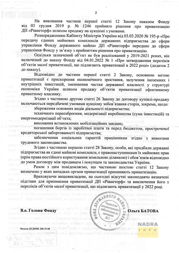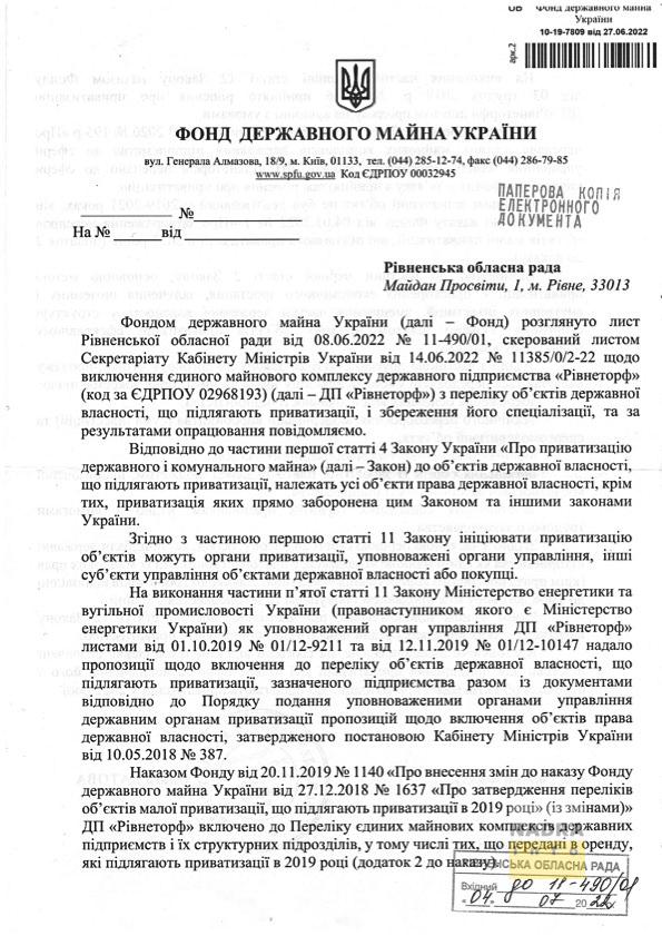 «… на сьогодні відсутні законодавчо визначені підстави для припинення приватизації ДП «Рівнеторф» та виключення його з переліків обʼєктів малої приватизації, що підлягають приватизації у 2022 р.»