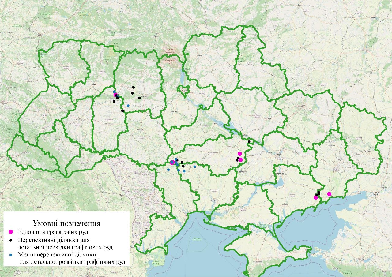Державним балансом запасів корисних копалин враховано 6 родовищ графіту в Україні, з яких на сьогодні розробляються лише два: ПАТ «Заваллівський графітовий комбінат» – Південно-Східна ділянка Заваллівського родовища (Кіровоградська обл.), ТОВ «Українська постачальна група» – Зарічна ділянка Заваллівського родовища графіту (Одеська обл.), ТОВ «Розвиток Побужжя» – Південна ділянка Балахівського родовища. У 2021 році ТОВ «СПИС Україна» перемогла в аукціоні з продажу спеціальних дозволів на користування надрами Городнявської ділянки Буртинського родовища графіту. Крім того, в Україні є не заліцензовані родовища і ділянки, де можна почати видобування графіту. Обліковані запаси графіту в Україні складають близько 18 млн тонн. Також є потенціал для приросту запасів графіту, його ресурси оцінюються в 50-100 млн тонн.