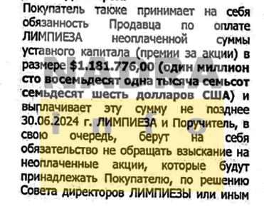 Із копій документів, з якими NADRA.INFO вдалося ознайомитися, випливає, що ця сума складається з двох: USD 3 000 000 мали бути сплачені безпосередньо за 25% акцій Limpieza. Ще USD 1 181 776 мали бути внесені Bolatico як сплата за несплачені акції Limpieza: