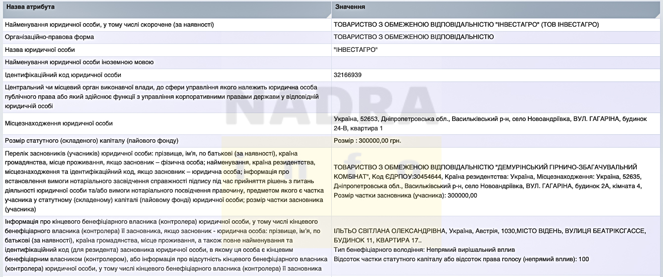 А от кінцевим бенефіціарним власником компанії ТОВ «ІнвестАгро», якою володіє ТОВ «Демурінський ГЗК» вказано Світлану Ільтьо: