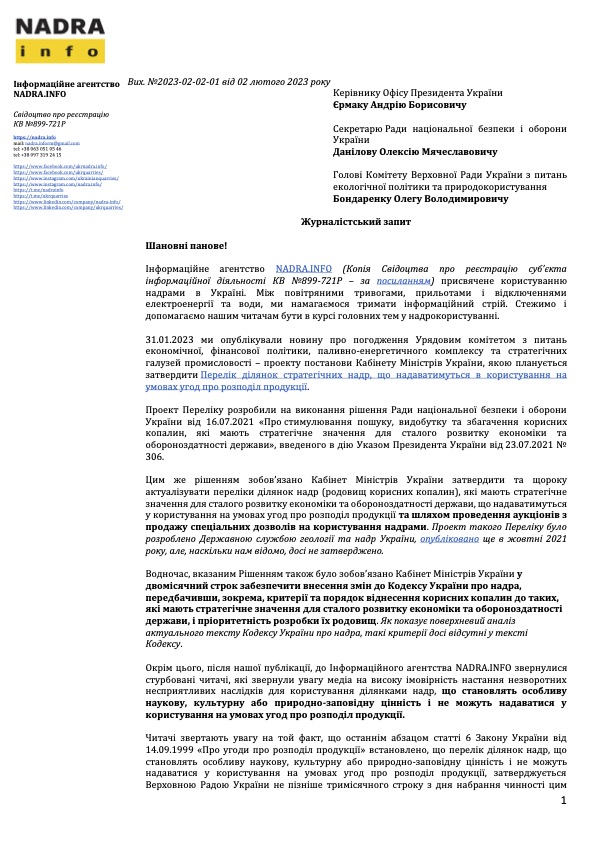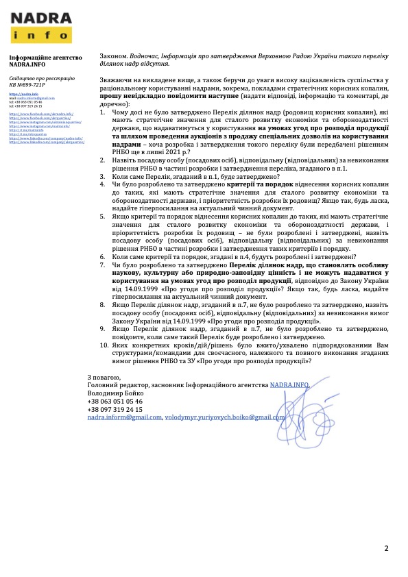Хто і чому не виконує рішення РНБО і ЗУ «Про угоди про розподіл продукції» в частині розроблення та затвердження переліків ділянок надр – розповімо, коли отримаємо відповіді на наш запит: