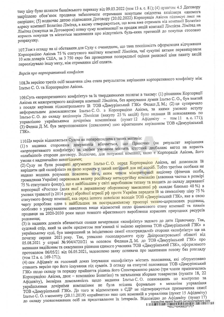 03.02.2023 Апеляційна палата Вищого антикорупційного суду повністю задовольнила апеляційну скаргу Міністерства юстиції, і постановила стягнути в дохід держави 100% статутних капіталів компаній ТОВ «Демурінський ГЗК», ТОВ «Тай-Мінералс», ТОВ «Інвестагро», а також кошти і майно Демурінського ГЗК. Фактично визнавши, що всі три компанії контролюються російським мільярдером, акціонером корпорації ВСМПО-Авісма Михайлом Шелковим, щодо якого раніше були запроваджені санкції РНБО.