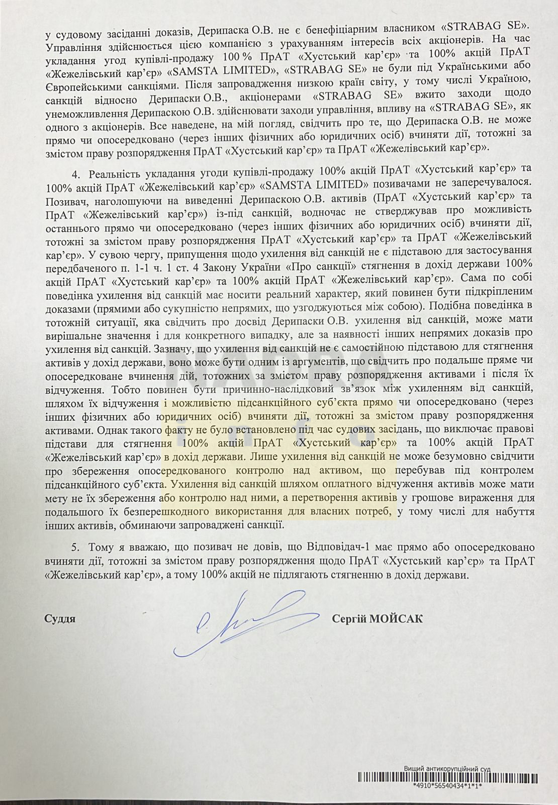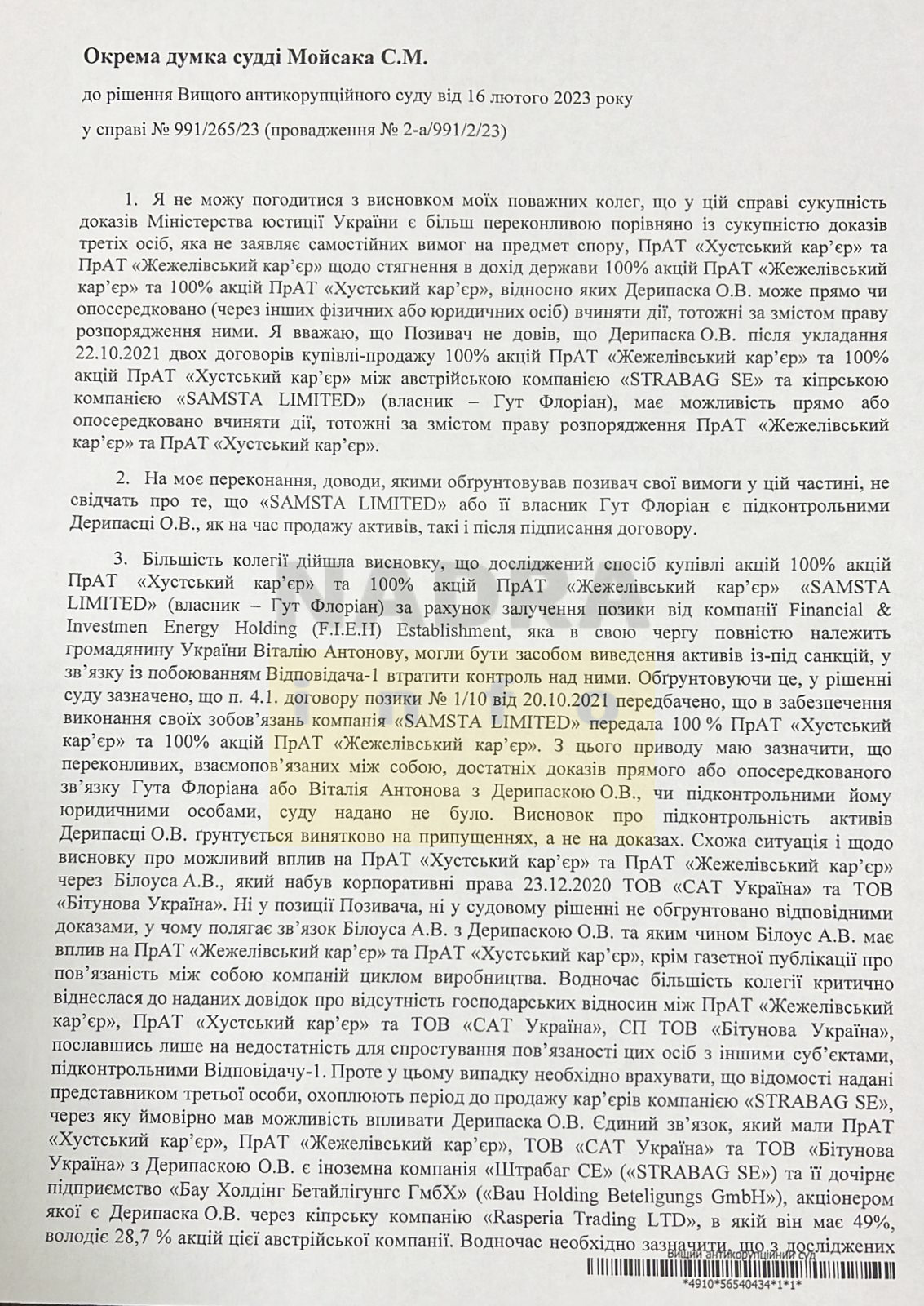 Суддя Сергій Мойсак виклав Окрему думку, в якій висловив переконання, що Міністерство юстиції не довело, що Олег Дерипаска має можливість «прямо або опосередковано вчиняти дії, тотожні за змістом праву розпорядження щодо ПрАТ «Хустський кар`єр» та ПрАТ «Жежелівський кар`єр», а тому 100% акцій не підлягають стягненню в дохід держави».