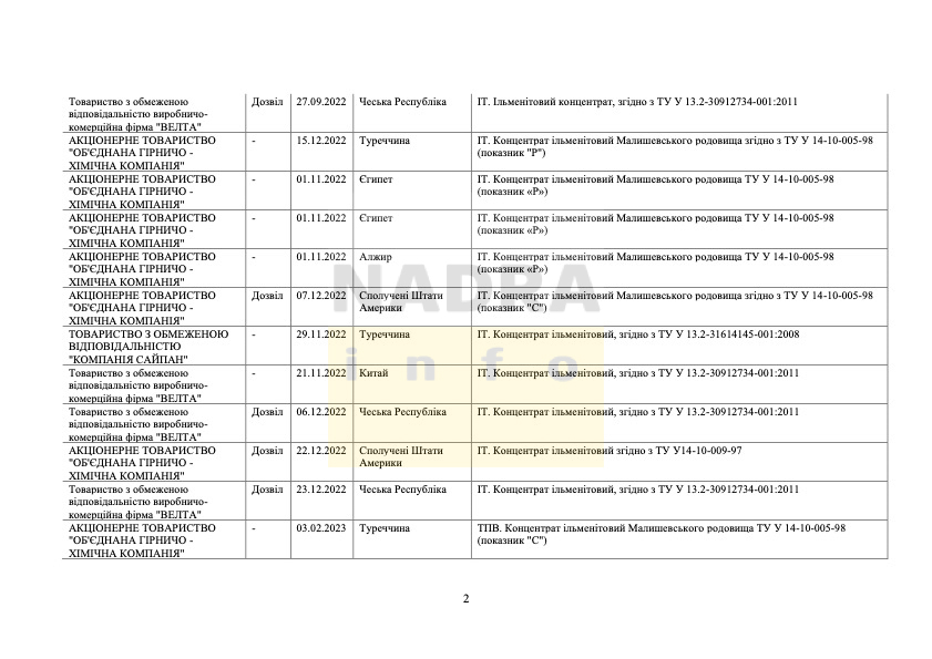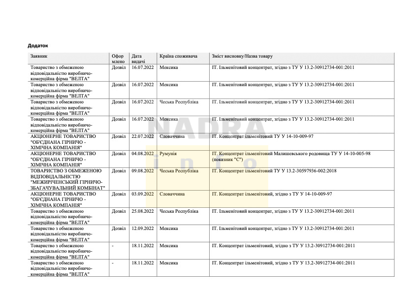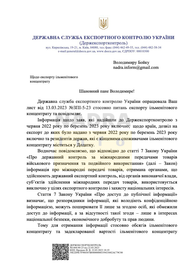 За період часу від липня 2022 р. до лютого 2023 р. включно, Державна служба експортного контролю надала 18 дозволів на експорт ільменітового концентрату. Про таке Інформаційному агентству NADRA.INFO повідомили у Держекспортконтролі.