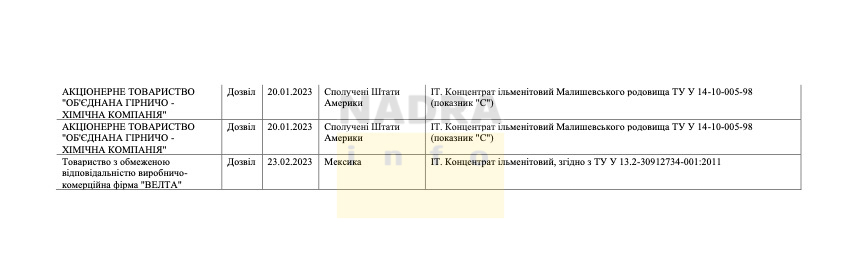 - АТ «Об’єднана гірничо-хімічна компанія» (Держава Україна) – 7 дозволів;