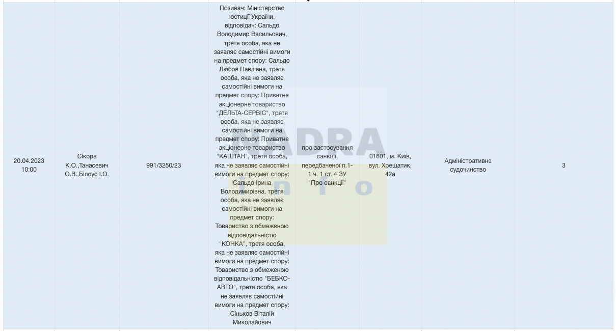 На 20.04.2023, о 10:00 заплановано початок засідання Вищого антикорупційного суду у справі за позовом Міністерства юстиції України до підсанкційного екс-мера Херсона Володимира Сальдо, підозрюваного у державній зраді. Повідомляє ІА NADRA.INFO із посиланням на дані Судової влади України: