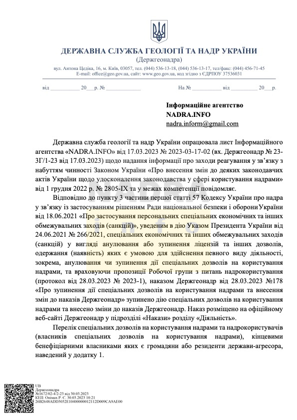 Як випливає з відповіді Держгеонадр, всі ці надрокористувачі відповідають ознакам, встановленим частиною третьою статті 13 Кодексу України про надра. Ця норма набрала чинності 28.03.2023 і говорить, що користувачами надр в Україні не можуть бути, зокрема, юридичні особи, у яких істотну участь мають або є кінцевими бенефіціарними власниками фізичні особи-громадяни та (або) резиденти держави, визнаної Верховною Радою України державою-агресором, а також фізичні особи-громадяни та (або) резиденти держави, визнаної Верховною Радою України державою-агресором.