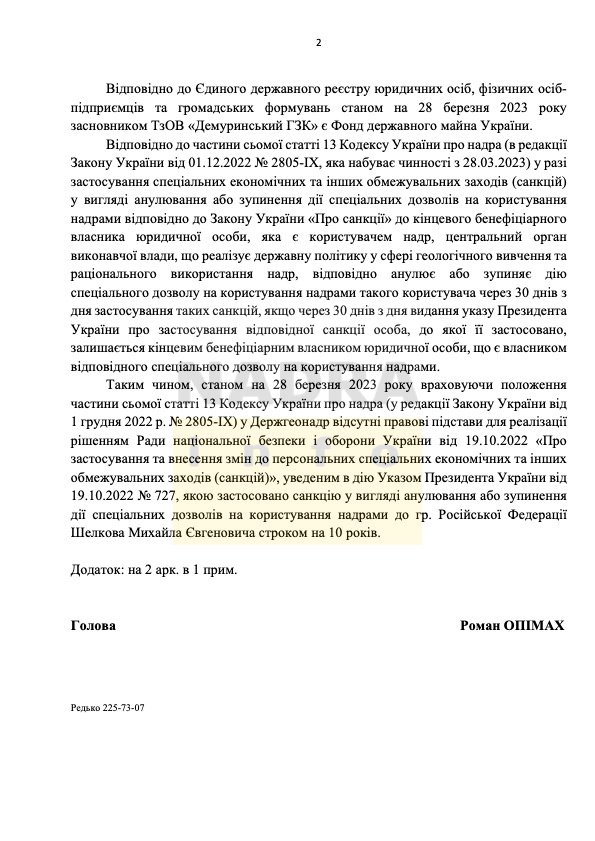 Нагадаємо, 24.02.2023 Кабінет Міністрів України визначив Фонд державного майна України уповноваженим органом управління активами, стягнутими в дохід держави Вищим антикорупційним судом у справі за позовом Міністерства юстиції до російського мільярдера Михайла Шелкова. Саме Михайло Шелков до 28.03.2023 був вказаний як контролер Демурінського ГЗК, що і створювало ризики зупинення спецдозволу компанії.
