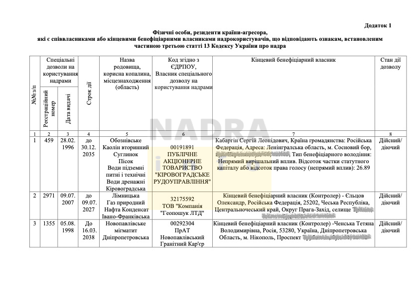 - Росіянин Кабаргін Сергій, зареєстрований у Ленінградській області РФ, має вирішальний вплив на ПАТ «Кіровоградське рудоуправління» (Кіровоградська обл.): каолін вторинний, суглинок, пісок, води підземні питні і технічні, води дренажні – родовище Обознівське. Спецдозвіл №459 дійсний/діючий;