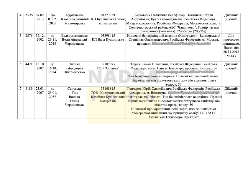 - Гончаров Юрій з Волгограду володіє 50% ТОВ «Кострижівський комбінат будівельних матеріалів» (Чернівецька): гіпс, вапняк, глина – родовище Скитське. Спецдозвіл №4189 дійсний/діючий.