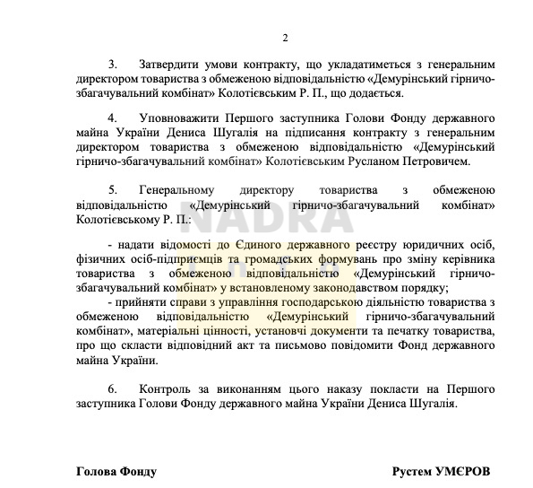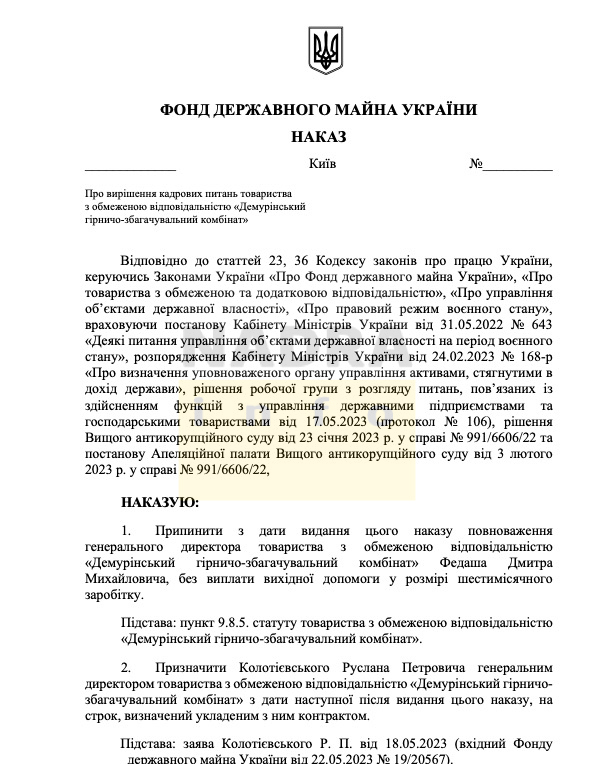 Згідно з Наказом, Руслан Колотієвський має приступити до виконання обовʼязків повноцінного керівника ДемГЗК сьогодні, 26.05.2023.