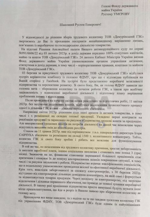 У травні трудовий колектив ДемГЗК звернувся з листами щодо невиплати заробітних плат до Голови ФДМУ Рустема Умєрова: