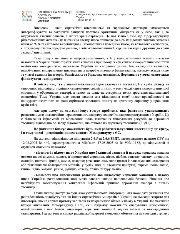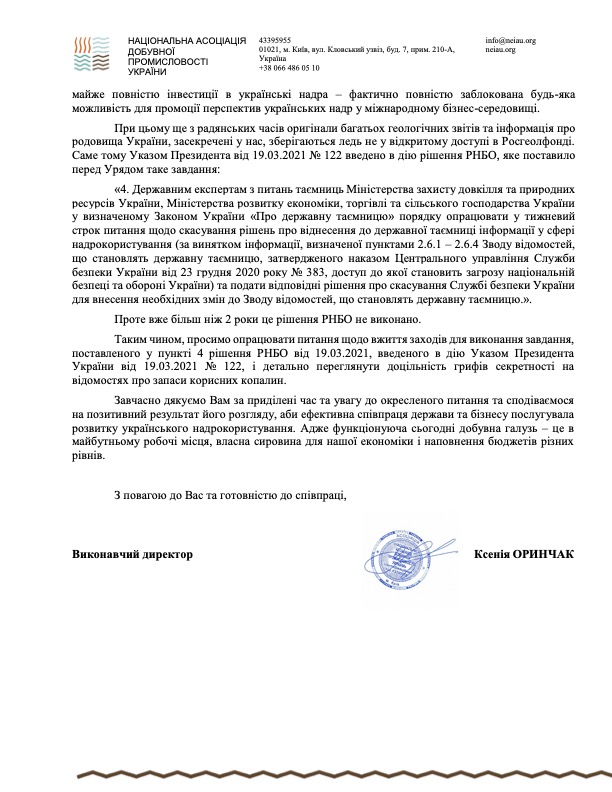 Процес триває з 2021 року, але до сьогодні проблема не розв’язана, що фактично унеможливлює для надрокористувачів будь-яке оперування інформацією, а, отже – і розвиток видобутку та експорту українських корисних копалин, залучення інвестицій у цей напрям, а також реалізацію Меморандуму з ЄС про стратегічну сировину, підписаного в липні 2021 року.