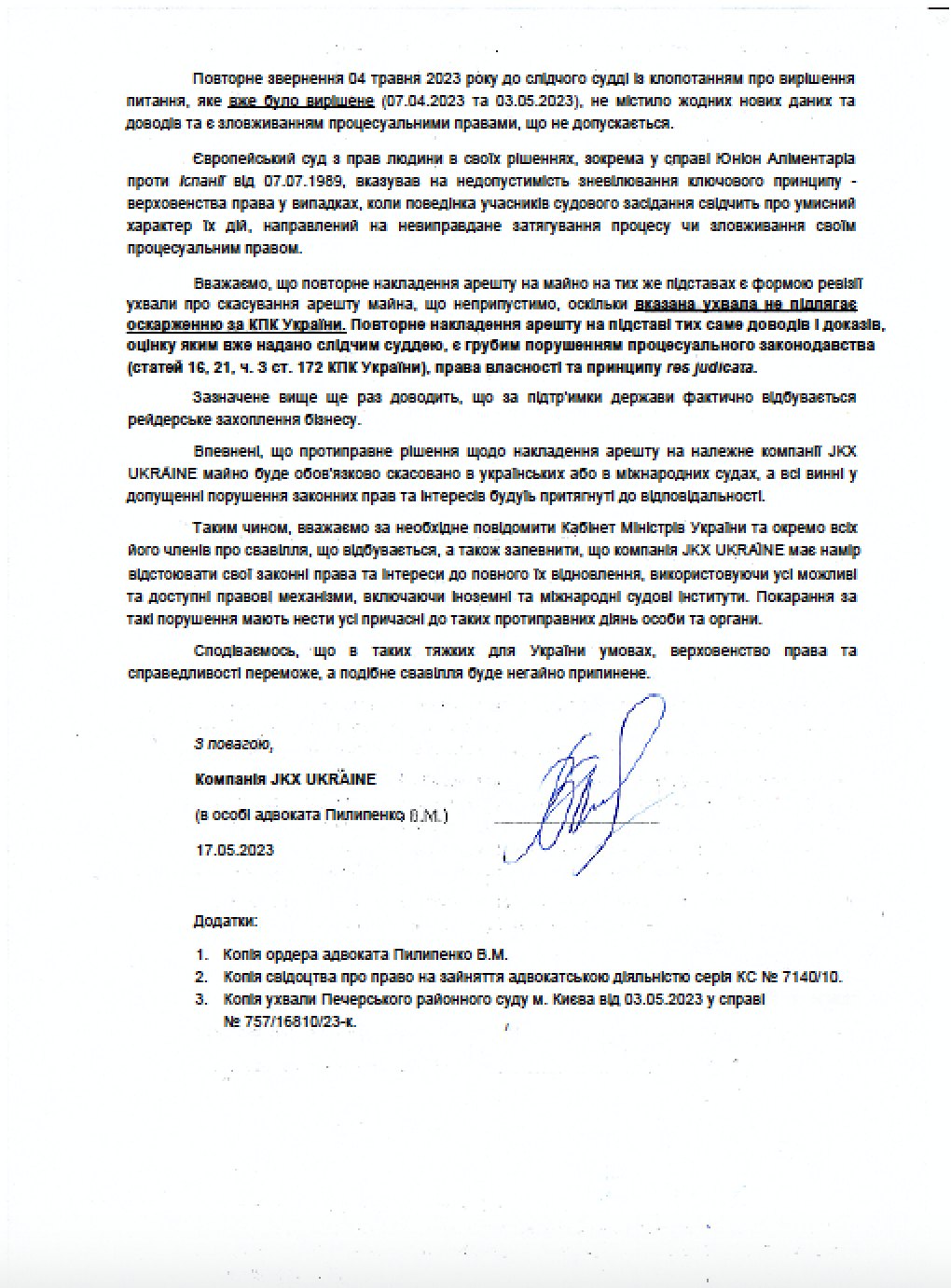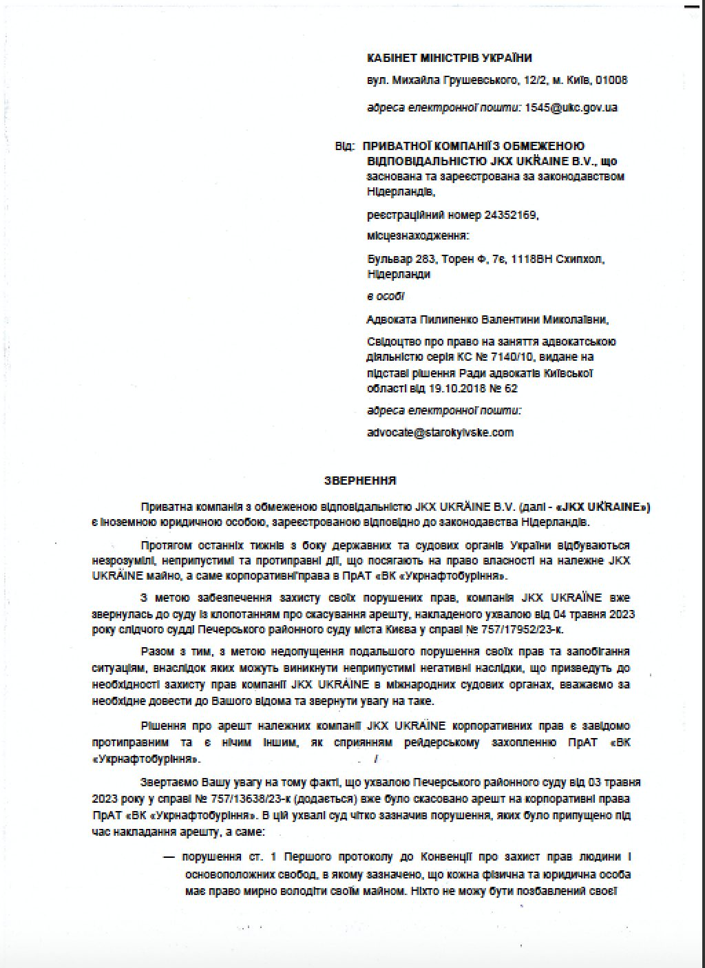 «Рішення про арешт належних компанії JKX UKRAINE корпоративних прав є завідомо протиправним та є нічим іншим, як сприянням рейдерському захопленню ПрАТ «ВК «Укрнафтобуріння»… Вимушені констатувати, що в даному випадку має місце посадовий підлог та зловживання процесуальними правами, які надано стороні обвинувачення (прокурору та слідчому)», – заявив JKX UKRAINE у зверненні до Кабміна: