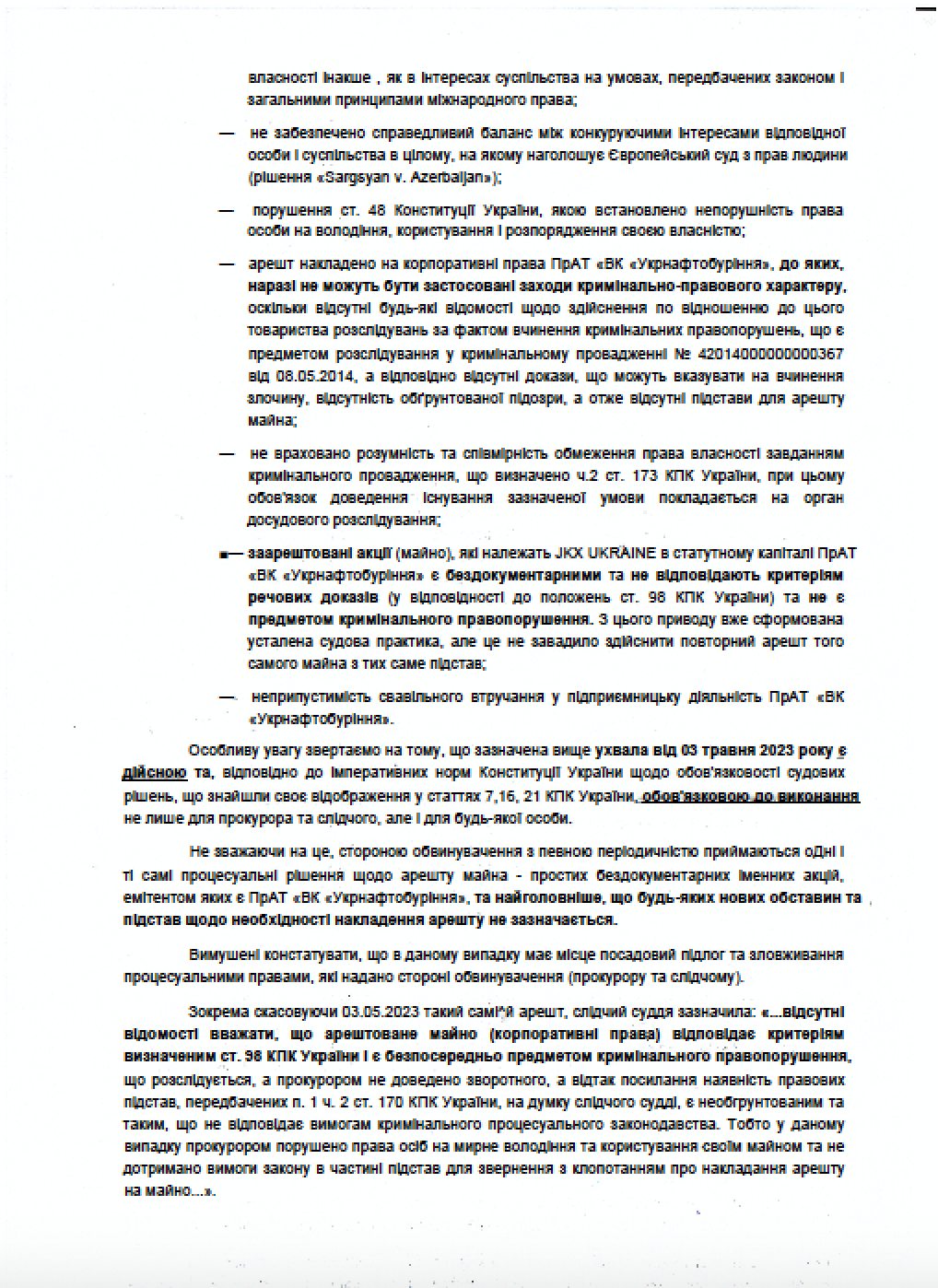 JKX UKRAINE наголосила, що арешт акцій УНБ є безпідставним, і позиція компанії вже була підтверджена судовим рішенням. «Звертаємо вашу увагу на тому факті, що ухвалою Печерського районного суду від 03 травня 2023 року у справі № 757/13638/23-к вже було скасовано арешт на корпоративні права ПрАТ «ВК «Укрнафтобуріння». В цій ухвалі суд чітко зазначив порушення, яких було припущено під час накладання арешту», – зазначається у повідомленні. Деякі з таких порушень стосуються положень Конвенції про захист прав людини і основоположних свобод, Конституції України та Кримінального кодексу України.