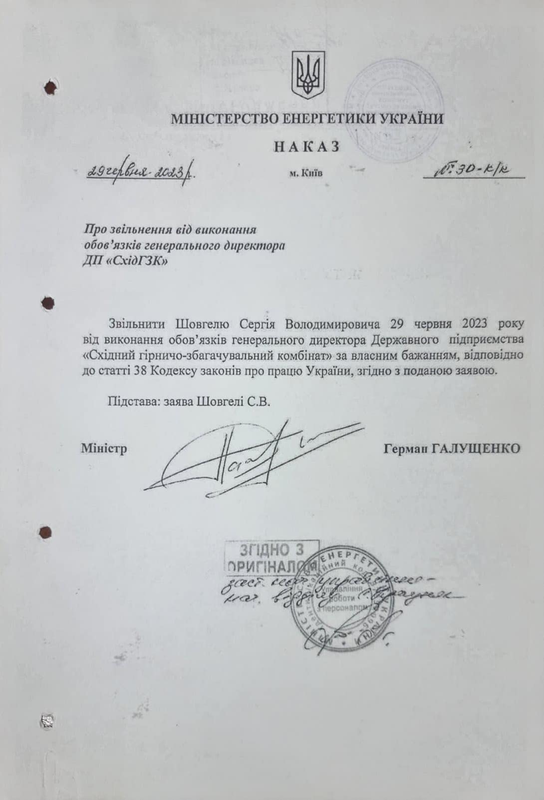«29 червня 2023 року Міністр енергетики України Герман Галущенко підписав наказ про звільнення Сергія Шовгелі від виконання обов’язків генерального директора ДП “СхідГЗК”», – йдеться у дописі, який ілюструє копія наказу:
