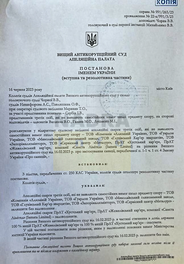 Апеляційна палата Вищого антикорупційного суду скасувала рішення першої інстанції ВАКС про стягнення в дохід держави акцій ПрАТ «Жежелівський карʼєр» і ПрАТ «Хустський карʼєр». Повідомляє ІА NADRA.INFO із зали суду:
