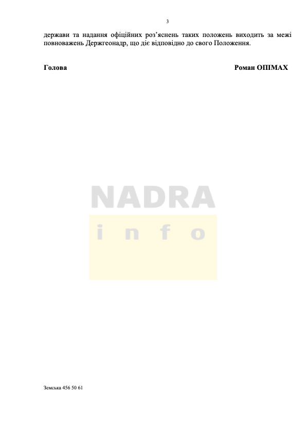 Також у Службі зазначили, що «листи Держгеонадр носять інформаційний характер, не встановлюють норм права та не містять організаційно-розпорядчих вимог до суб’єкта господарювання», і наголосили, «що надання офіційних тлумачень нормативних положень законодавчих актів з метою встановлення їх однозначного та правильного розуміння і застосування на всій території держави та надання офіційних роз’яснень таких положень виходить за межі повноважень Держгеонадр, що діє відповідно до свого Положення».