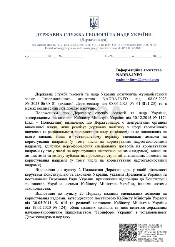 «Станом на 26.06.2023 року Підприємство не набуло права власності на Дозвіл. Угода про умови користування надрами між Підприємством та Держгеонадрами не укладена», – повідомив NADRA.INFO Роман Опімах у відповідь на запит, отриману нами 26.06.2023: