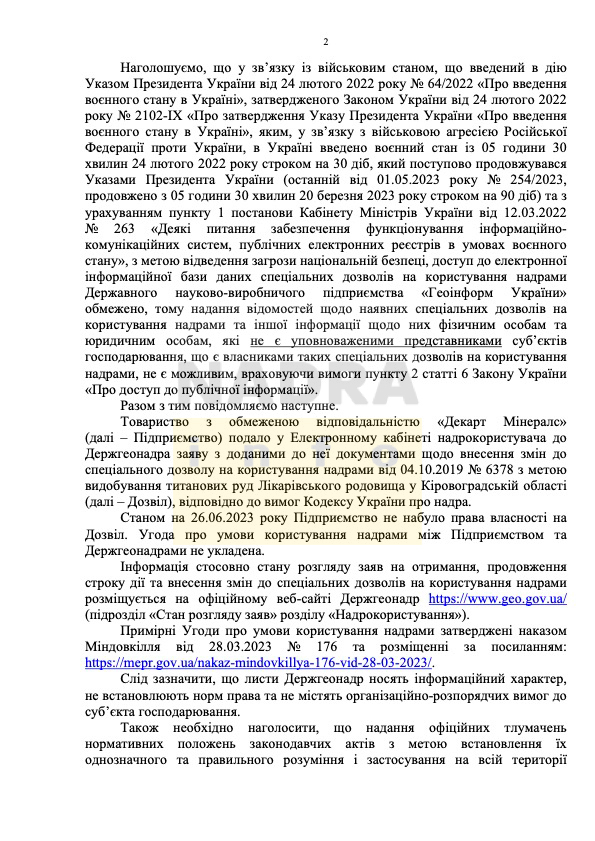 Незадовго після публікації ІА NADRA.INFO Велта виходить з Лікарівського родовища титанових руд? Державна служба геології та надр України внесла зміни до спеціального дозволу №6378 на Лікарівське родовище (Кіровоградська обл.), задовольнивши заяву ТОВ «Декарт Мінералс» (м. Дніпро). Про це свідчать дані реєстру Держгеонадр «Інформація про заяви на отримання спеціальних дозволів на користування надрами, що надійшли від субʼєктів господарювання, які здійснюють діяльність у видобувних галузях» та наказ Голови Держгеонадр Романа Опімаха №298 від 16.06.2023 (завантажити). В реєстрі статус заяви від ТОВ «Декарт Мінералс» змінився з «на розгляді» на «розглянуто», а в наказі Служби компанію Декарт Мінералс вже вказано як «надрокористувача». Підстава для внесення змін у спецдозвіл: «у зв’язку з відчуженням шляхом укладення договору купівлі-продажу права на користування надрами або внесення його як вкладу до статутного капіталу створеного за його участю суб’єкта господарювання».