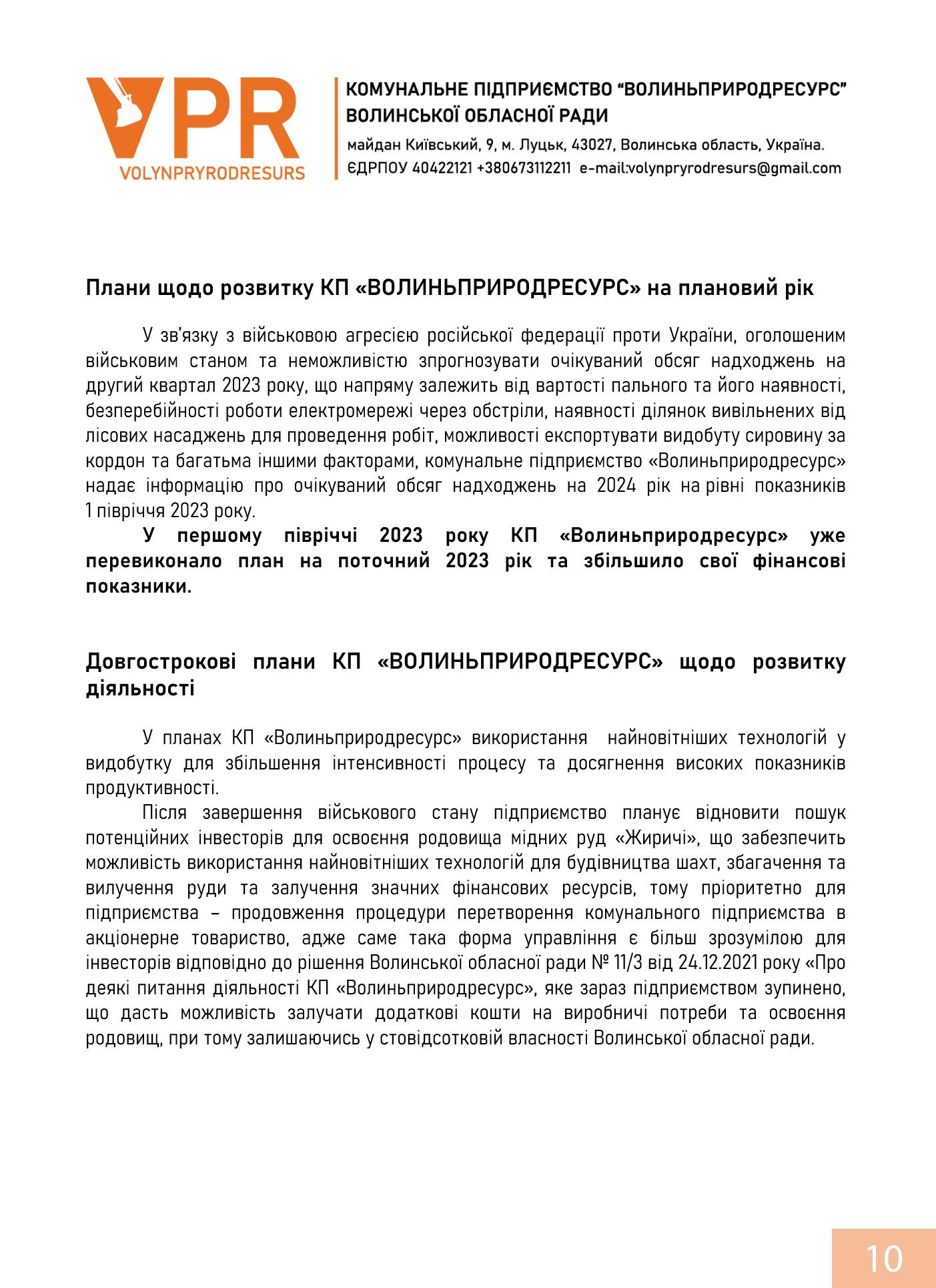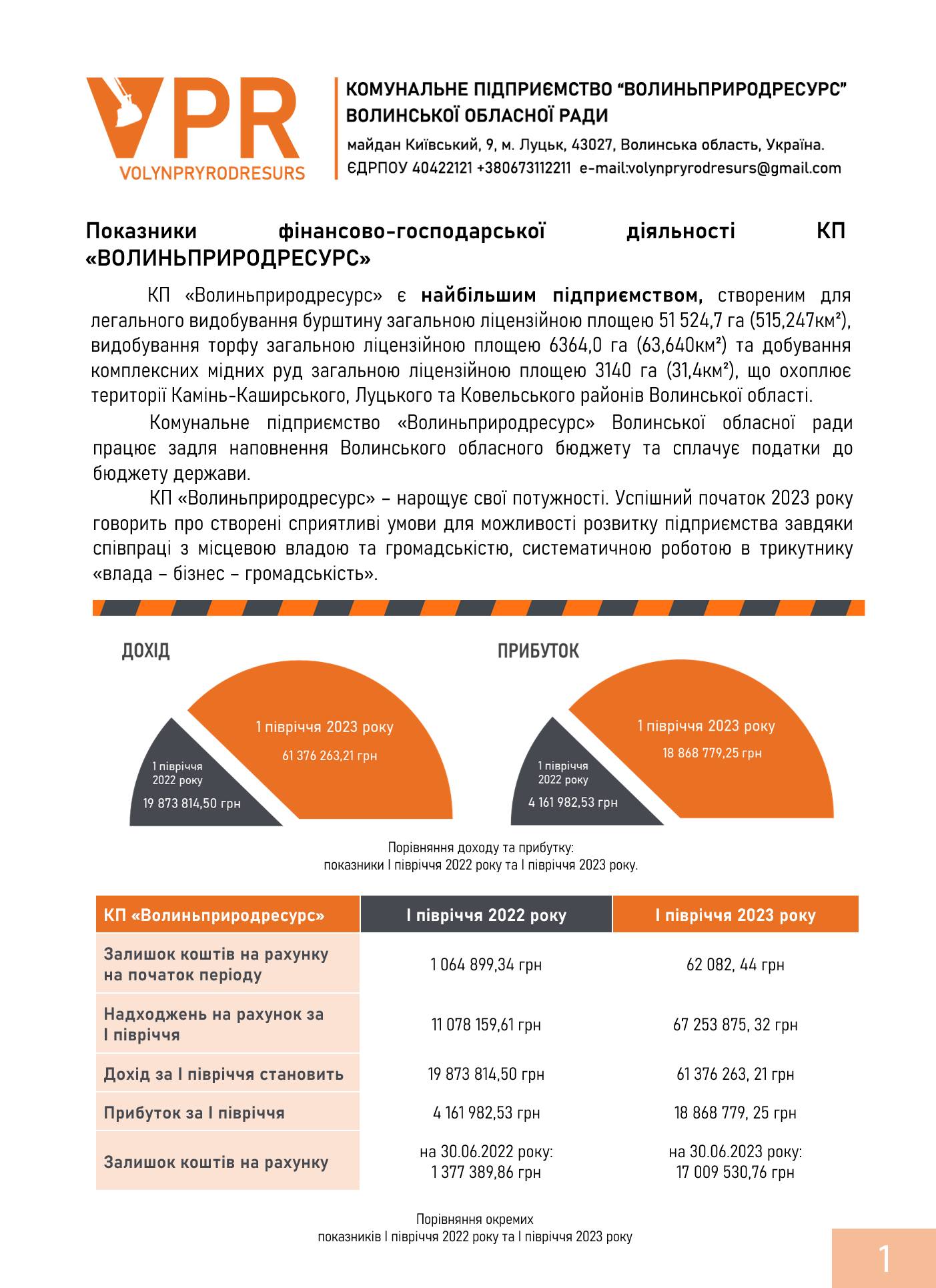 Порівняно з аналогічним періодом 2022 р., протягом І пів. 2023 р. КП «Волиньприродресурс» змогло суттєво наростити обсяги видобутку бурштину, а також дохід, прибуток і бюджетні платежі. Водночас, на підприємстві заявляють про протидію видобуванню торфу в одній із територіальних громад, а також вимушене заморожування міднорудного проекту на родовищі Жиричі.