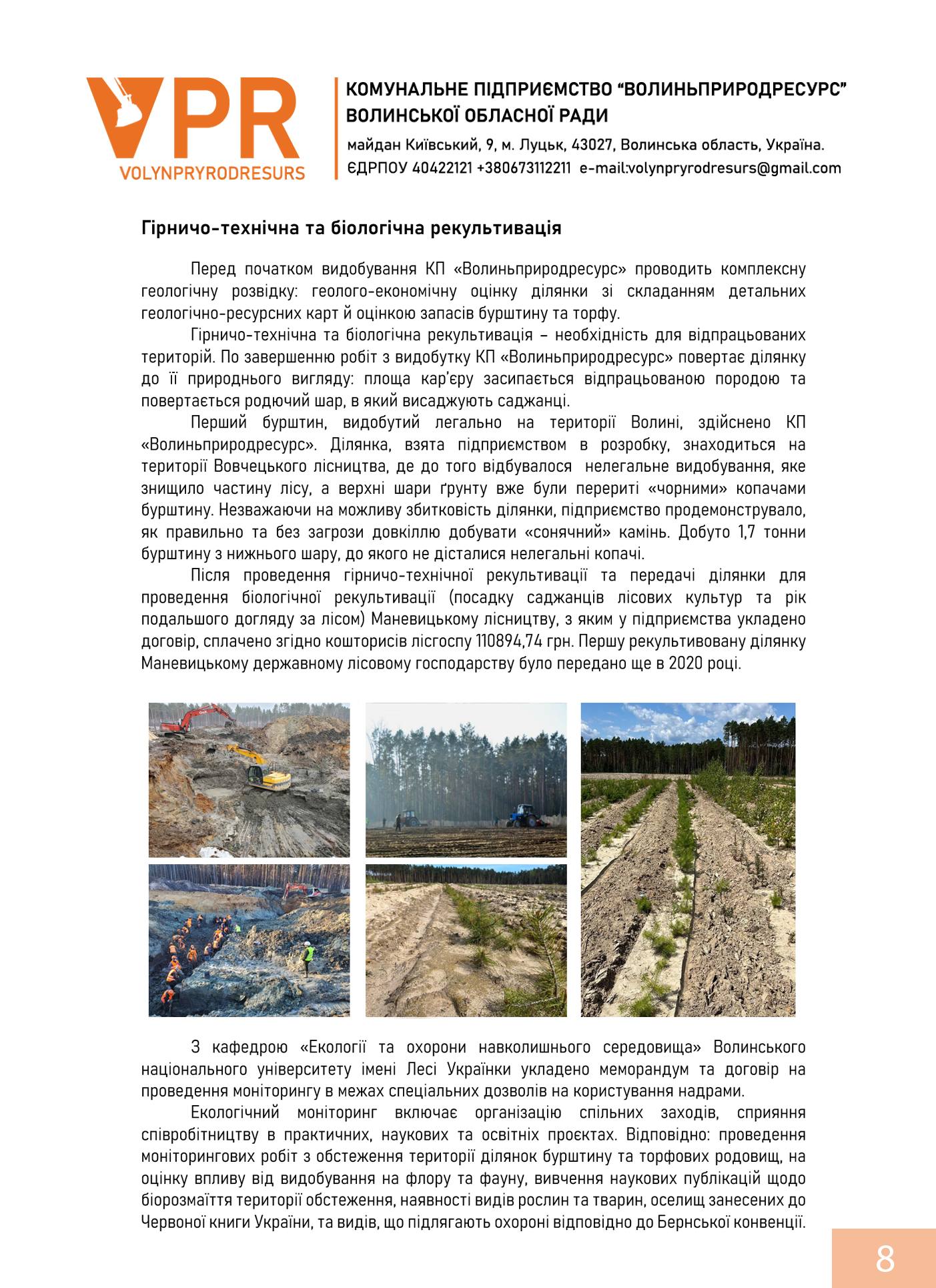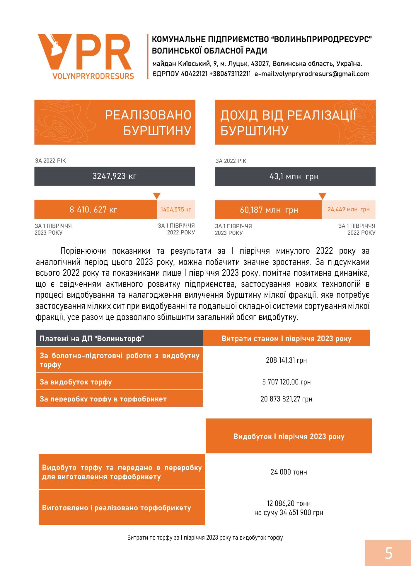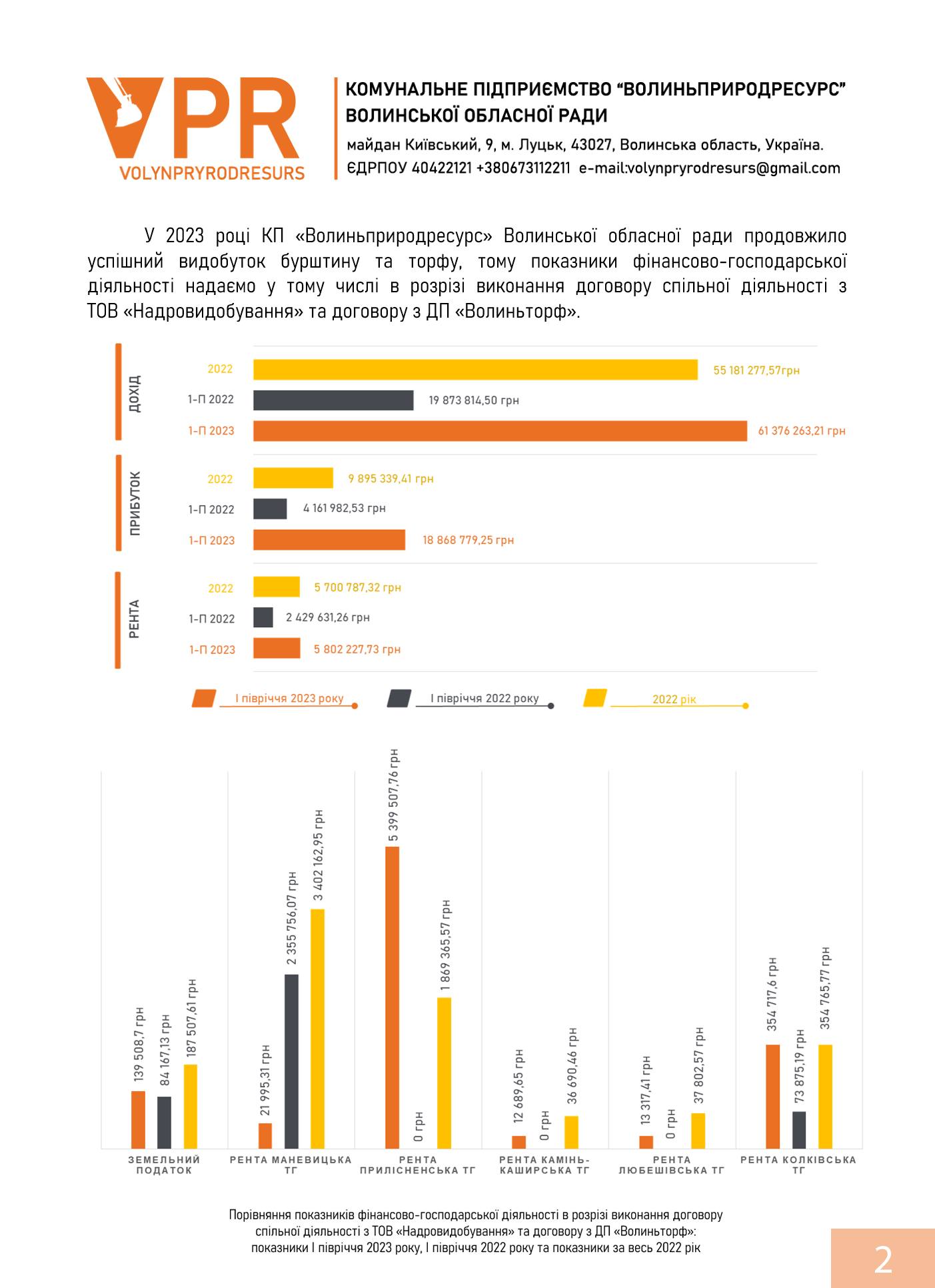 На тлі зростання видобутку, КП «Волиньприродресурс», в розрізі виконання договору спільної діяльності з ТОВ «Надровидобування» та договору з ДП «Волиньторф», зафіксувало і підвищення фінансових показників та бюджетних відрахувань.