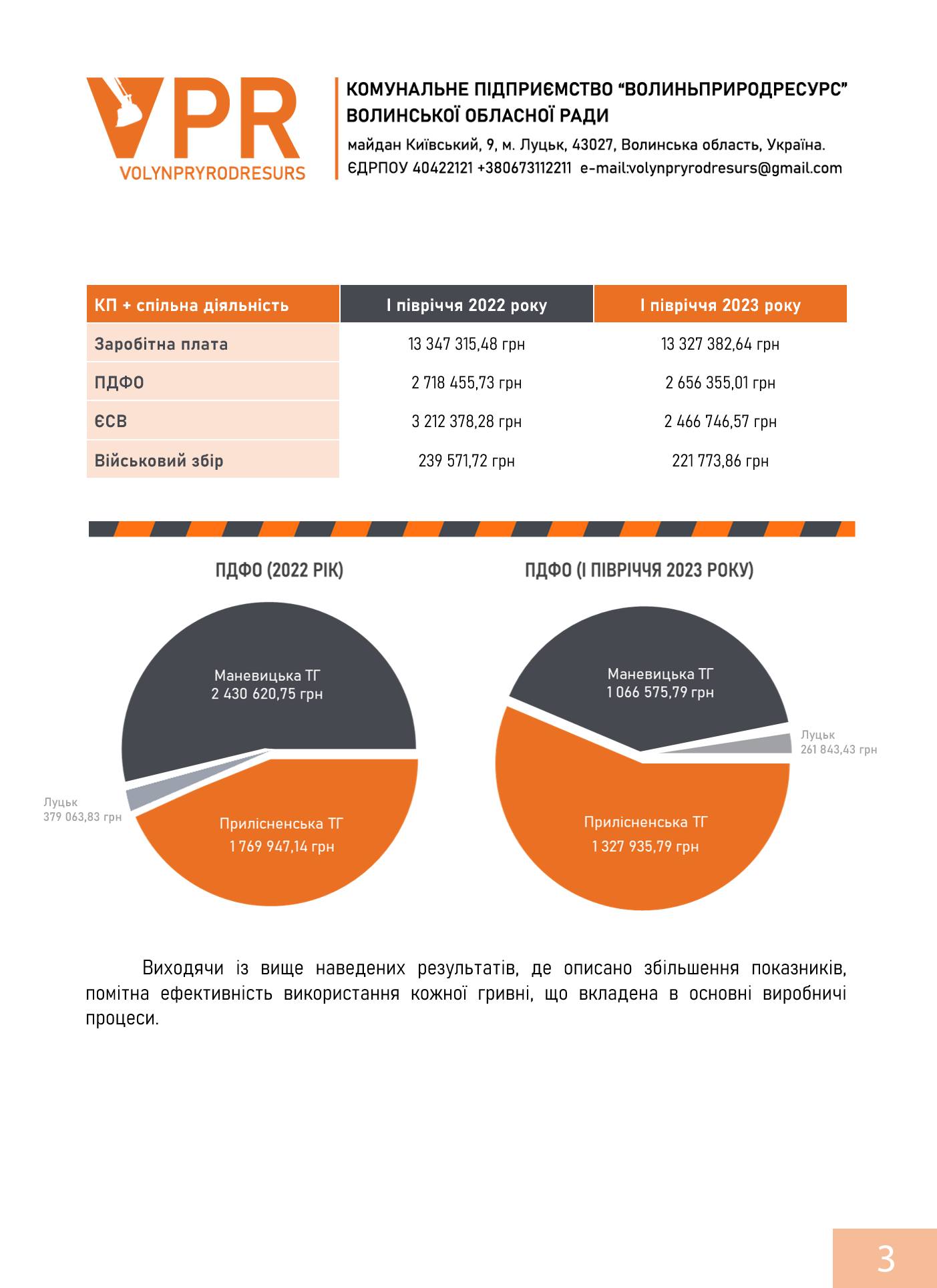 Комунальне підприємство «Волиньприродресурс» Волинської обласної ради оприлюднило зведені дані про результати фінансово-господарської діяльності за І півріччя 2023 р.. Повідомляє Інформаційне агентство NADRA.INFO із посиланням на офіційну Facebook-сторінку підприємства: