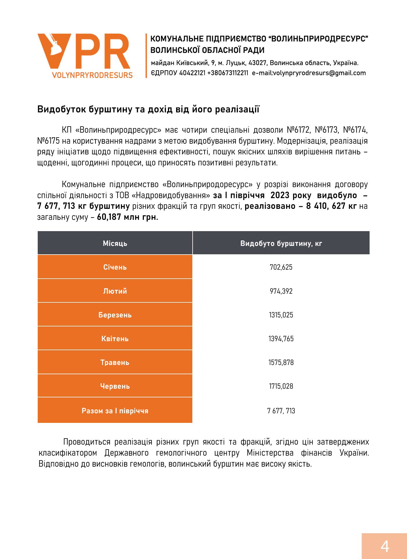У січні-червні 2023 р. КП «Волиньприродресурс» (у розрізі виконання договору спільної діяльності з ТОВ «Надровидобування») видобуло 7 677,713 кг бурштину-сирцю. Це більш як удвічі більше, ніж за весь 2022 р.. Реалізація бурштину за І пів. 2023 р. перевищила 8 400 кг (на загальну суму 60,187 млн грн). Що також більше, ніж за весь 2022 р.