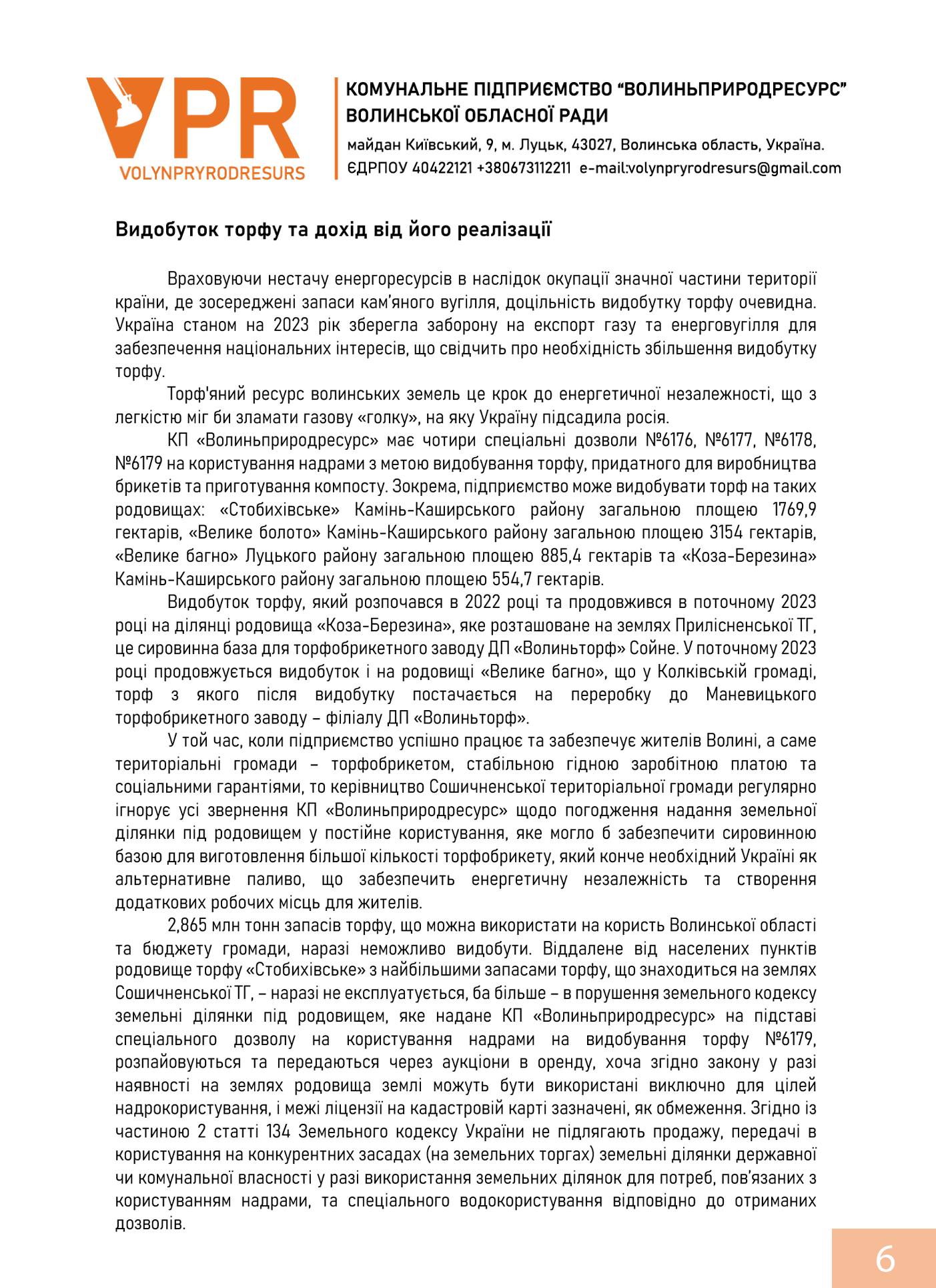 «У той час, коли підприємство успішно працює та забезпечує жителів Волині, а саме територіальні громади – торфобрикетом, стабільною гідною заробітною платою та соціальними гарантіями, то керівництво Сошичненської ТГ регулярно ігнорує усі звернення КП «Волиньприродресурс» щодо погодження надання земельної ділянки під родовищем у постійне користування, яке могло б забезпечити сировинною базою для виготовлення більшої кількості торфобрикету, який конче необхідний Україні як альтернативне паливо, що забезпечить енергетичну незалежність та створення додаткових робочих місць для жителів.