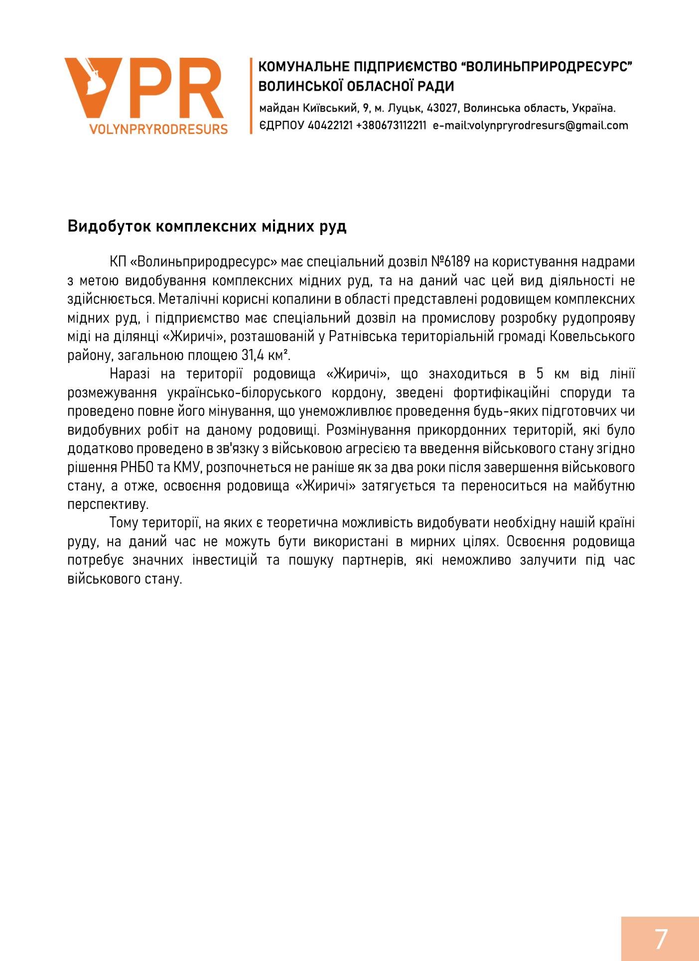 «Наразі на території родовища «Жиричі», що знаходиться в 5 км від лінії розмежування українсько-білоруського кордону, зведені фортифікаційні споруди та проведено повне його мінування, що унеможливлює проведення будь-яких підготовчих чи видобувних робіт на даному родовищі. Розмінування прикордонних територій, яке було додатково проведено в звʼязку з військовою агресією та введенням військового стану згідно з рішеннями РНБО та КМУ, розпочнеться не раніше як за два роки після завершення військового стану, а отже, освоєння «Жиричі» затягується та переноситься на майбутню перспективу.