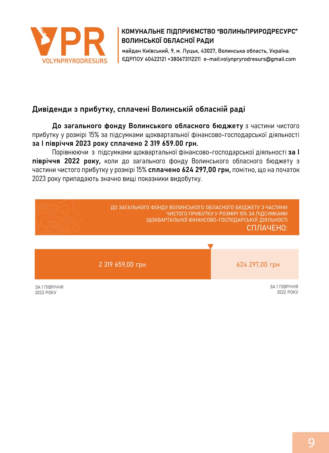 До загального фонду Волинського обласного бюджету з частини чистого прибутку у розмірі 15% за підсумками щоквартальної фінансово-господарської діяльності за І пів. 2023 р. сплачено 2,3 млн грн. Це майже учетверо більше, ніж за І пів. 2022 р. (0,625 млн грн).