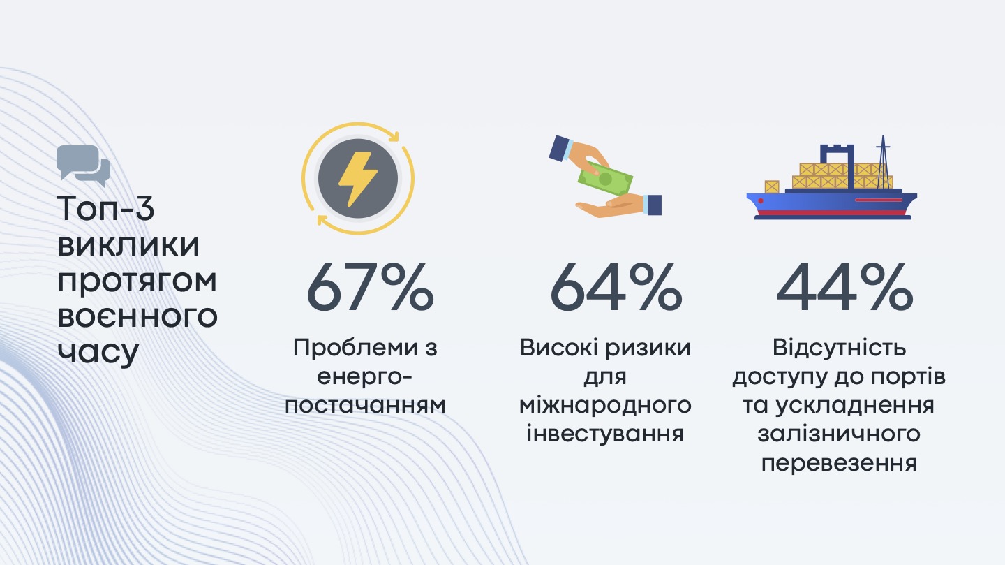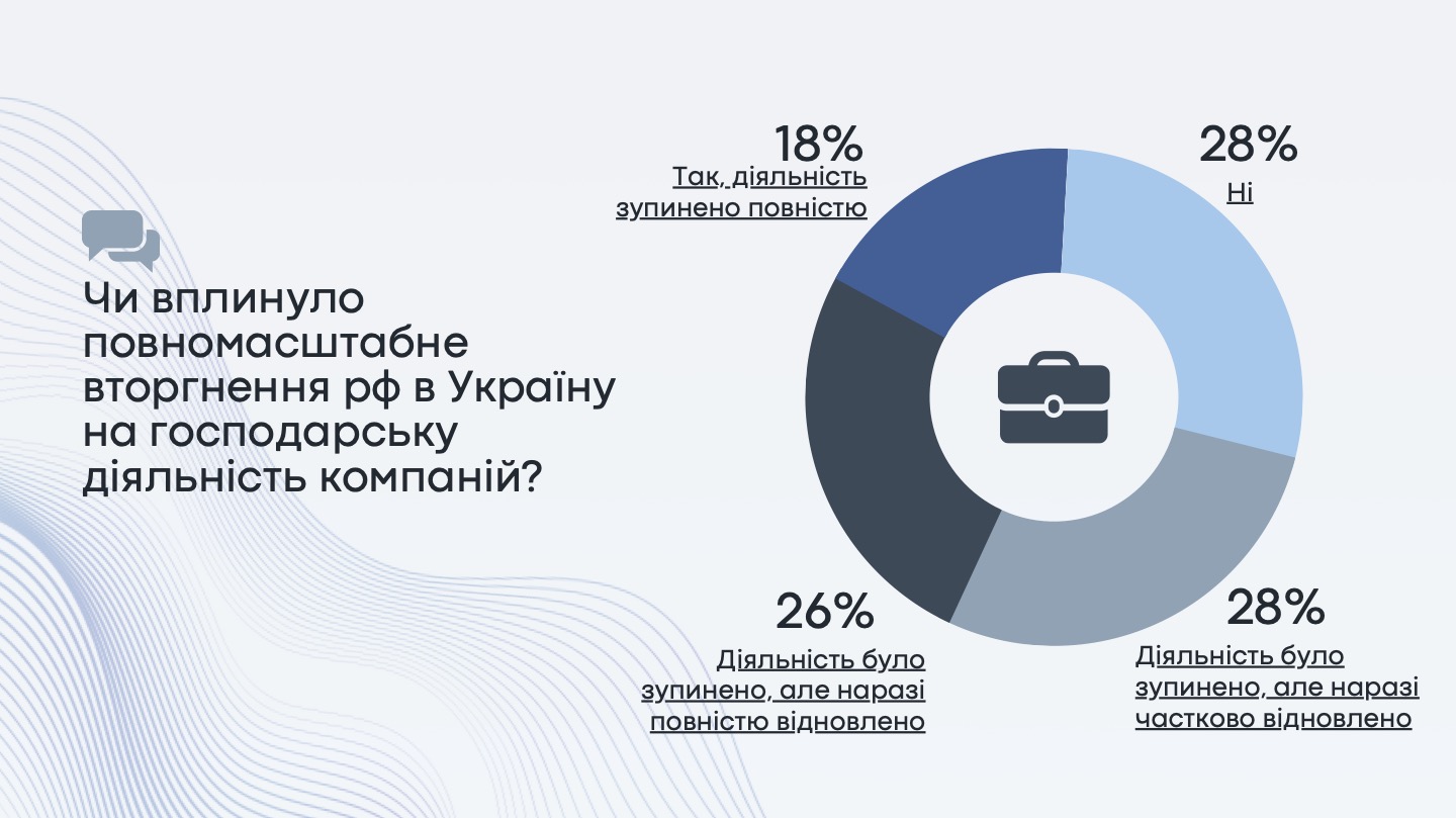 Повномасштабне вторгнення РФ в Україну вплинуло на господарську діяльність більшості компаній. Так, діяльність 54% компаній була зупинена, але наразі повністю або частково відновлена, діяльність 18% компаній досі зупинена повністю. Тільки 28% опитаних не відчули на собі вплив воєнних дій.