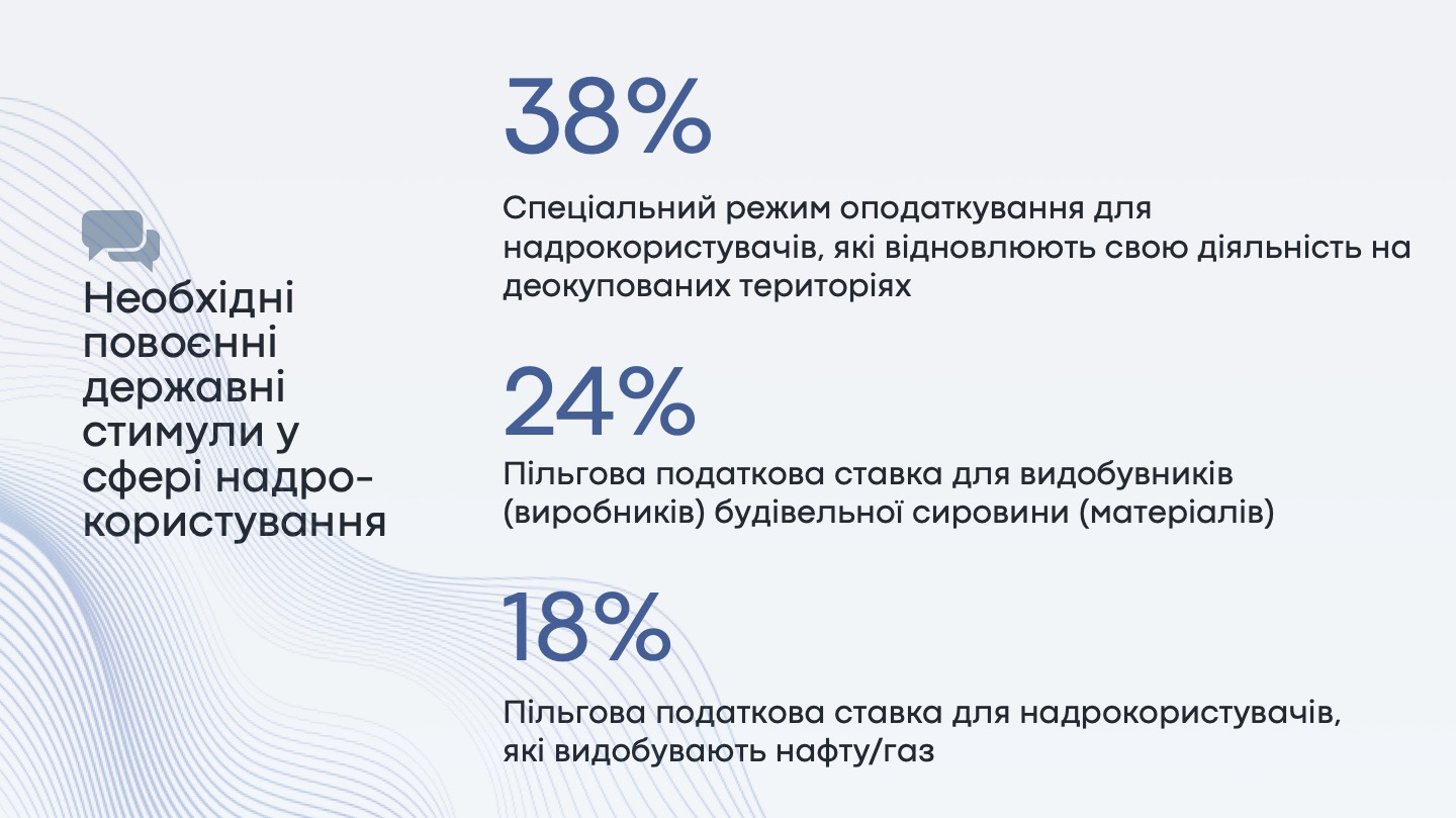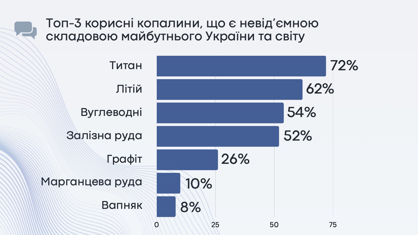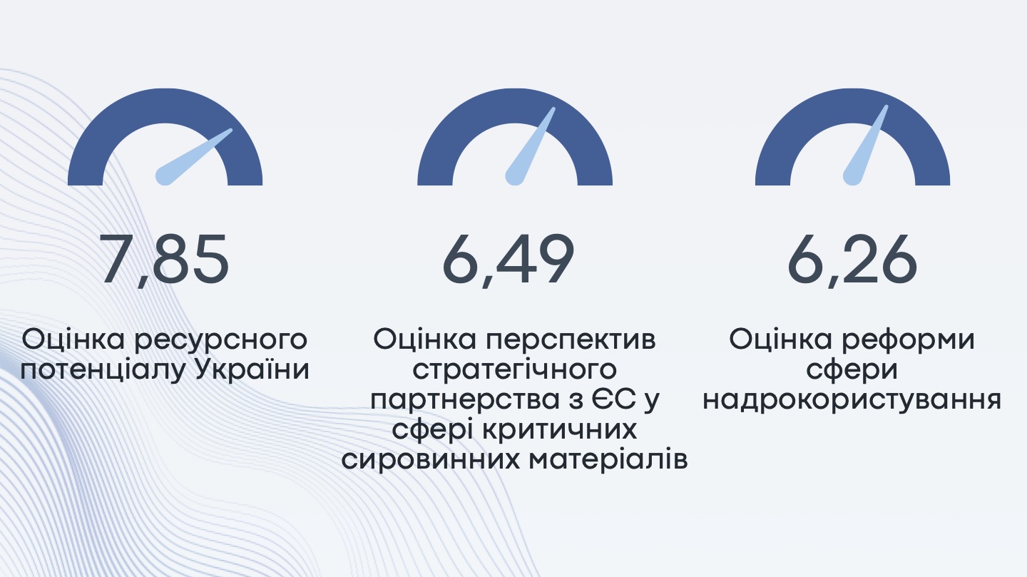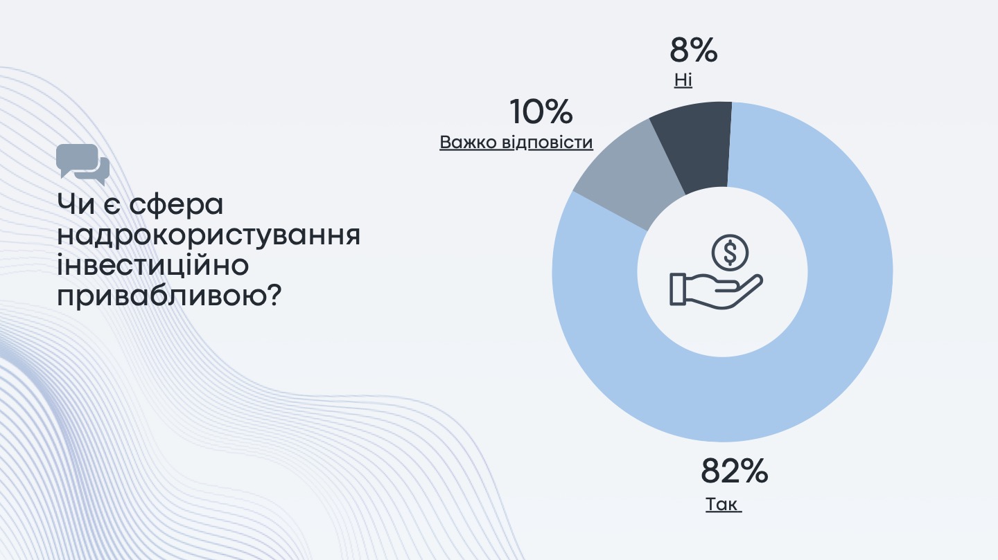 82% респондентів вважають сферу надрокористування інвестиційно привабливою, а ресурсний потенціал України оцінюють в 7,85 балів за 10-бальною шкалою. Найбільший потенціал в Україні та світі, на думку бізнесу, мають такі корисні копалини як титан, літій, вуглеводні (нафта, газ, конденсат) та залізна руда.